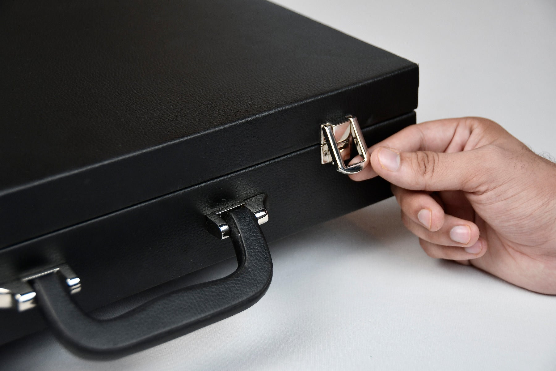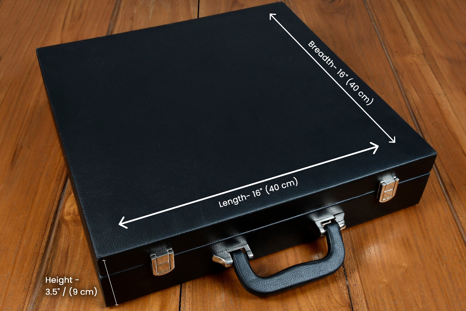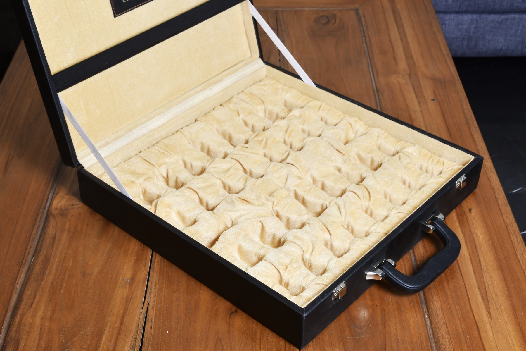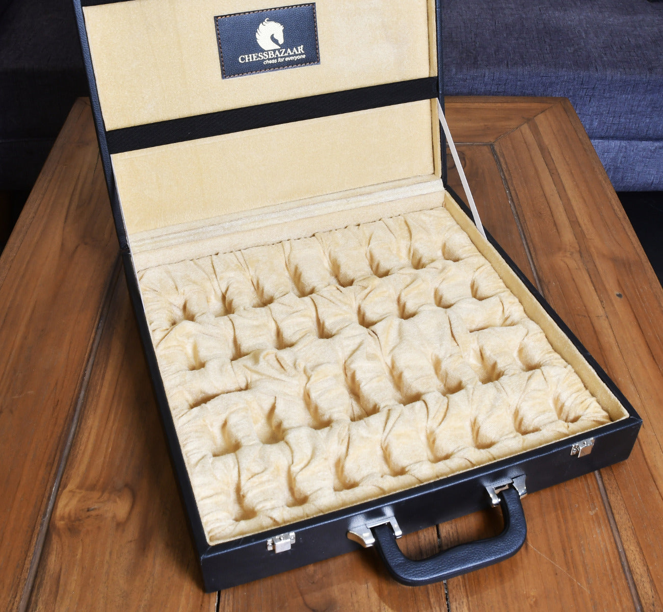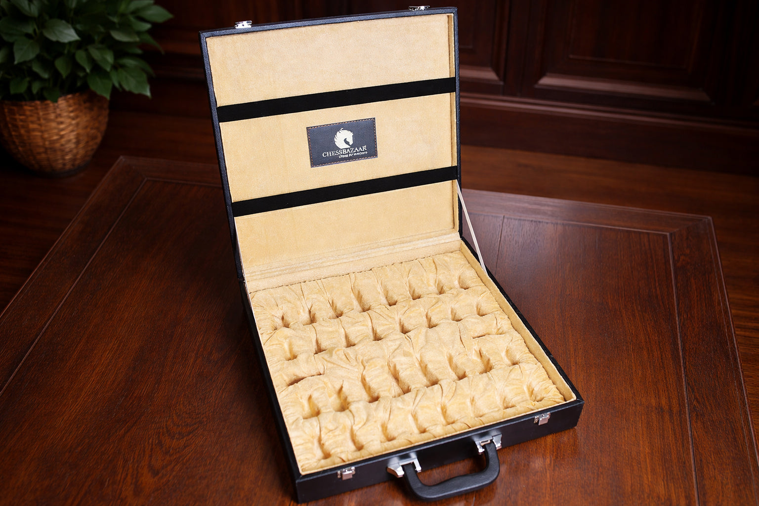 Black Leatherette Chess Set Storage Box Coffer for up to 15" Chessboard and Slots for Chess Pieces up to 3.0". Comes with a suitcase-style handle to carry and is also fitted with a lock for safe upkeep. The box has been lined with beige velvet to protect the pieces from scratching. The outer dimensions of the box are 16" (40 cm) x 16" (40 cm) x 3.5" / (9 cm). The sale is for an empty storage box only and the chess pieces are NOT INCLUDED in the sale. There are two trays in the box. The upper tray side can hold a chessboard for up to 15 inches. The lower tray is fixed inside the box. There is provision to put 18 pieces in either tray as most of the high-end sets come with extra queens. The weight of the storage box is 3000 grams (105.82 oz).