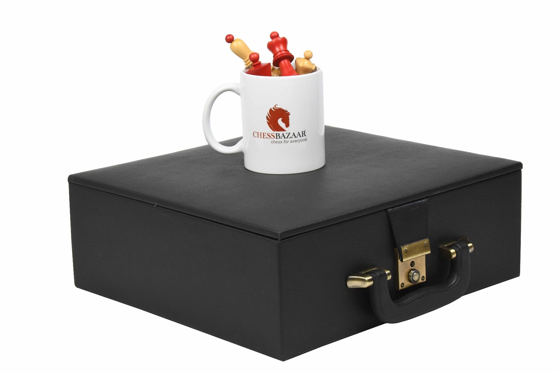 Leatherette storage box for chess pieces with double tray and fixed slots for putting each piece separately. This box is best suited for pieces with height 3.75" - 4.0". Comes with suitcase-style handle to carry and is also fitted with a lock for safe upkeep. The box has been lined with beige velvet to protect the pieces from scratching. The outer dimensions of the box are 12.20" (31 cm) x 12.99" (33 cm) x 4.5" (11.5 cm). The sale is for an empty storage box only and the chess pieces are NOT INCLUDED in the sale. There are two trays in the box to keep two sides of the set. The upper tray can be pulled out as it comes with little leatherette handles on either side. The lower tray is fixed inside the box. There is provision to put 17 pieces in either tray as most of high end sets come with extra queens. Weight of the storage box is 2650 grams (93.47 oz).