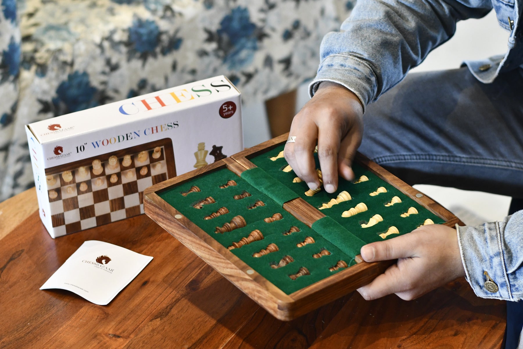 This sale is for a Folding Traveling Magnetic Chess Set in Sheesham Wood (Golden Rose Wood). Chess Set made of Sheesham Wood on the darker side and Box Wood on the lighter side.