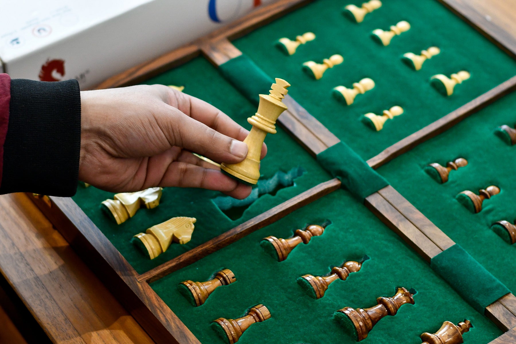 The Chess Pieces have been felted with Magnetic Studs and the board is fitted with concealed Iron sheet. The chess board folds into box of dimensions Size when open- 16" x 16" x 1.2"/ (40 cm x 40 cm x 3.0 cm) Size when Fold- 16" x 8" x 2.5" / (40 cm x 20 cm x 6.3 cm) Square Size - (1.73" x 1.73") / (44 mm x 44 mm). The box has been fixed with a soft casing with punched slots to put in chessmen.The King in this chess set is 3.0" (77 mm) high and the base is 1.10" (28 mm).