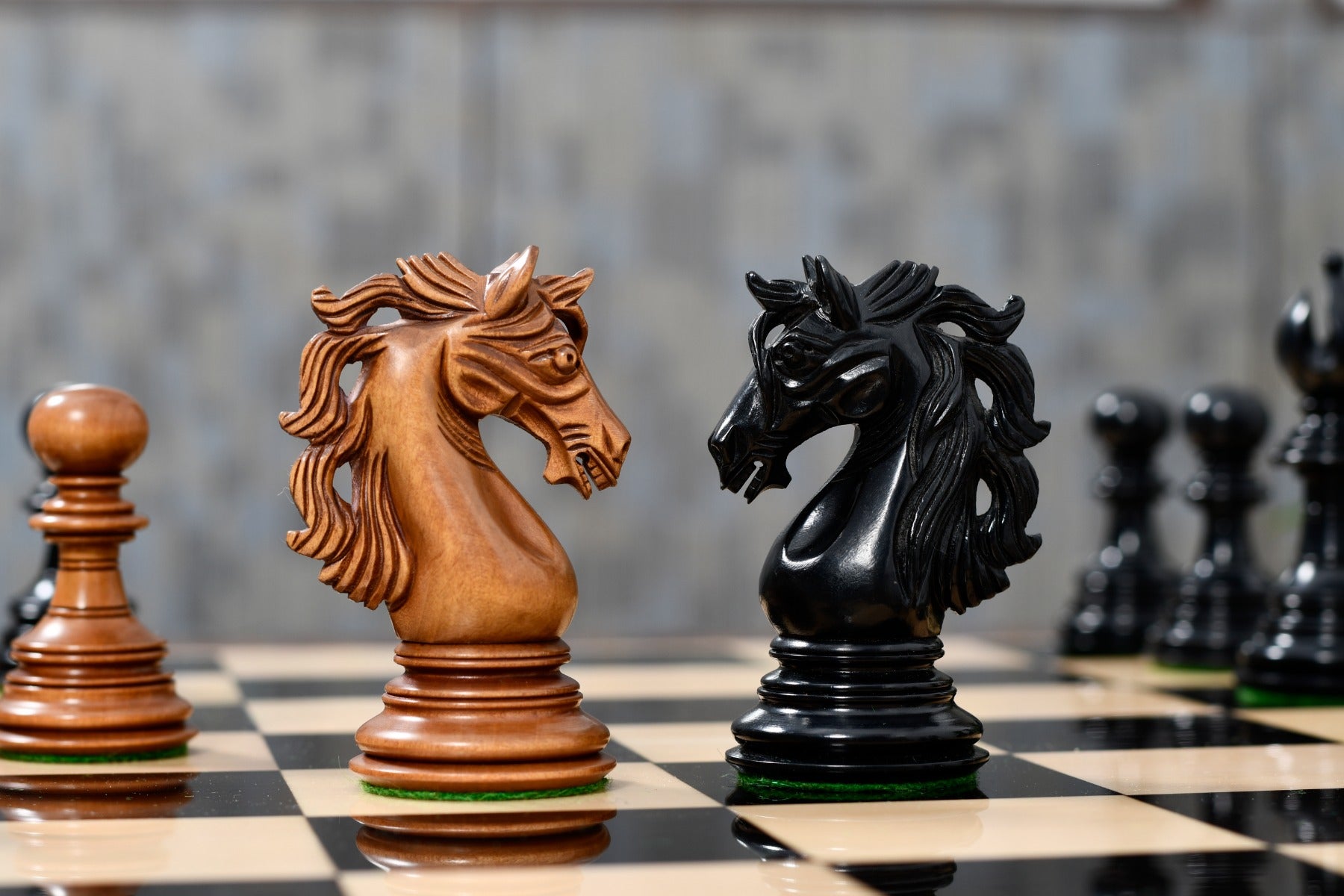 American Adios chess pieces are made in Ebony wood and Distressed Boxwood. The king is 4.4" high. The chess set comes with 34 pieces including 2 extra queens. This set is Triple Weighted and the chess pieces have thick green felt on their bases.