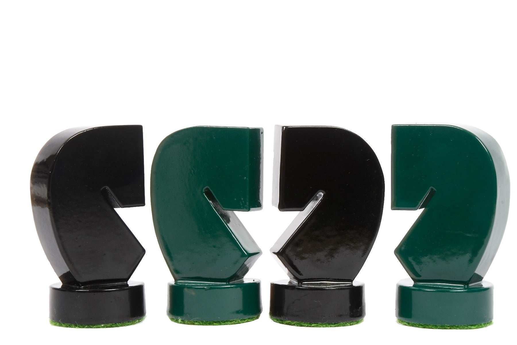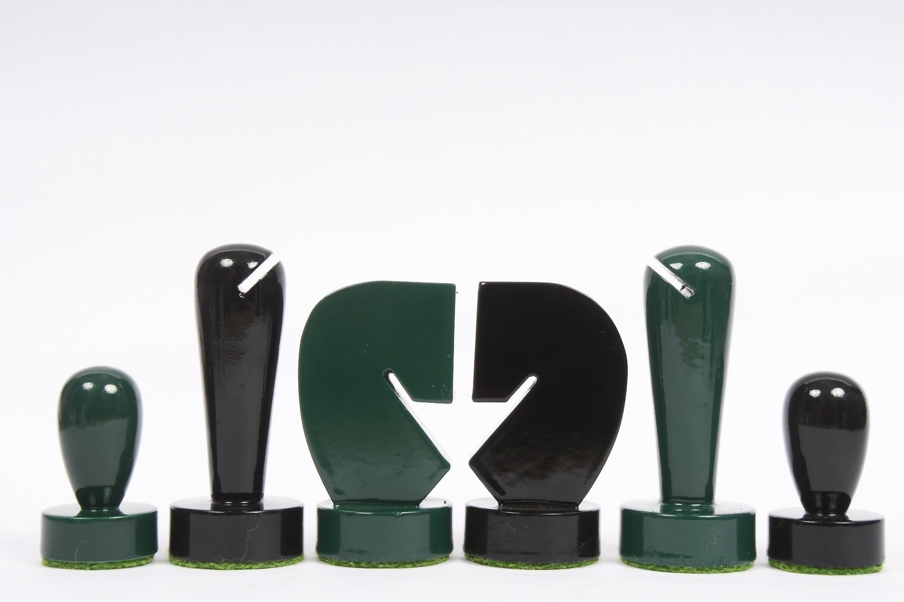 Berliner Series Modern Minimalist Chess Piece is made up of boxwood. The King proudly stands at 3.7" inches and its base is robust 1.2 inches. The dark chess pieces are made of Black painted boxwood and the opposing pieces are made up of Green painted boxwood. All chess pieces are expertly carved and double weighted for fantastic hand-feel and a very nice thud on the wooden chess board. Chess pieces have thick green felts which precisely envelops the base of each chessmen for smooth movement on the chess board. The chess pieces are well-crafted and represent the highest grade of knight carving skills that our Indian artisans have to offer. Chess pieces are meticulously hand crafted from the finest grade wood and polished by hand to give it a rich and long lasting shine.