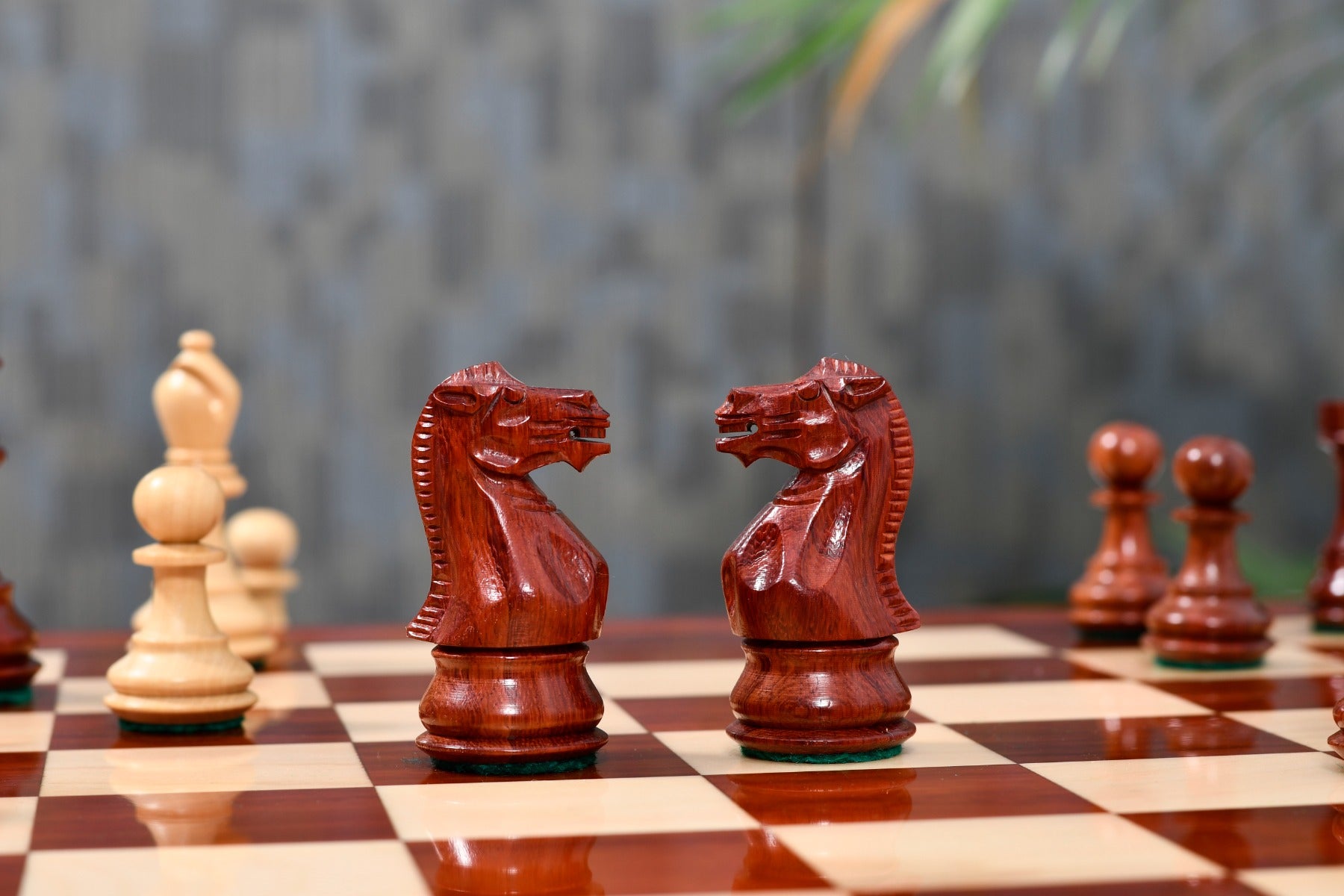 The Classic 101 Series in Staunton pattern, is made up of bud rose wood and boxwood. The King proudly stands at 3.0 inches and its base is robust 1.3 inches. The dark chess pieces are made of bud rose wood and the opposing pieces are made up of boxwood which is traditionally used for white side. The set comes with free extra queens for effortless pawn promotion. All chess pieces are expertly carved and weighted for fantastic hand-feel and a very nice thud on the wooden chess board. Chess pieces have leather base pads which precisely envelops the base of each chess men for smooth movement on the chess board. The chess pieces are well-crafted and represent the highest grade of knight carving skills that our Indian artisans have to offer. Chess pieces are meticulously hand crafted from the finest grade wood and polished by hand to give it a rich and long lasting shine.