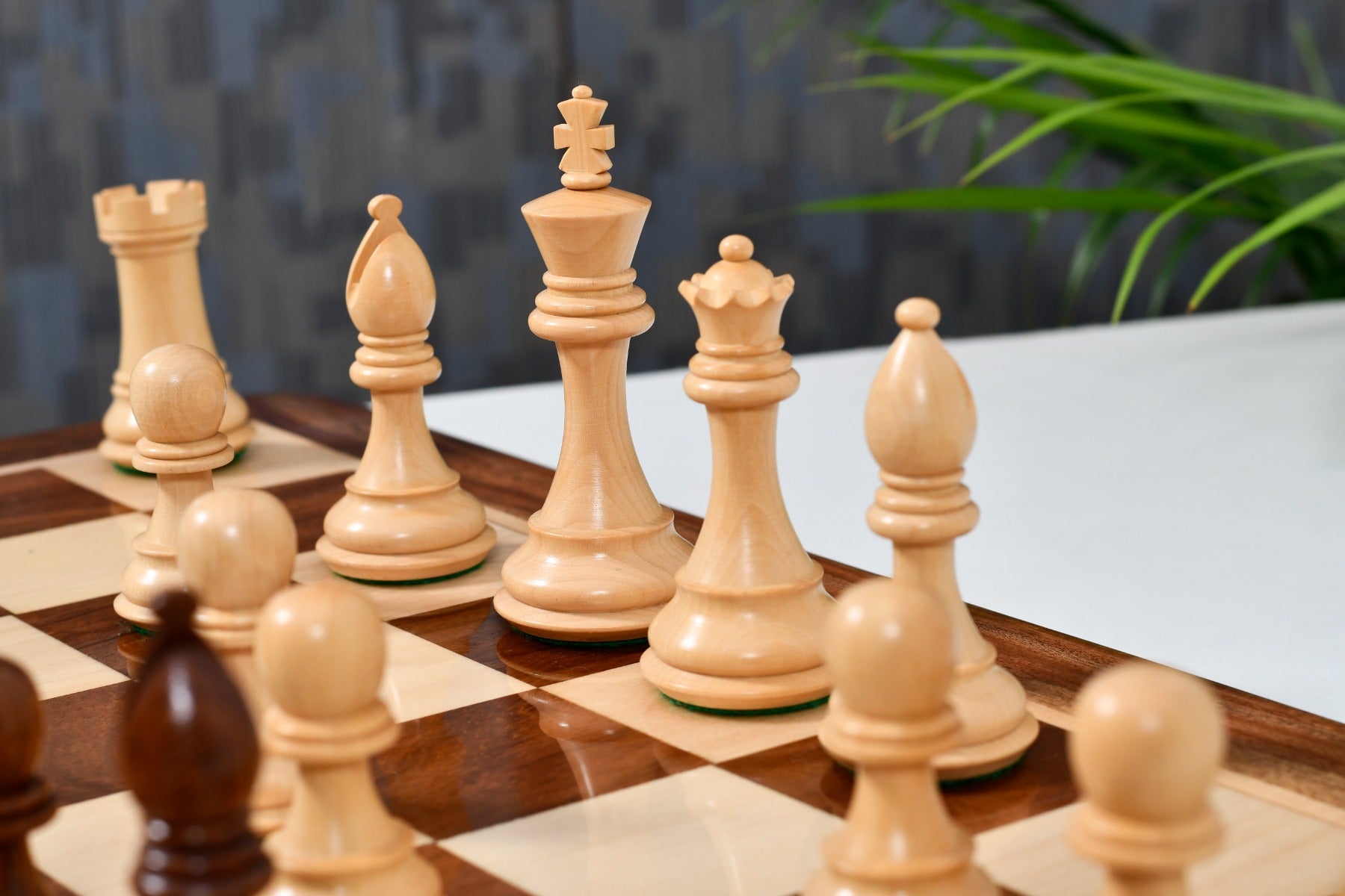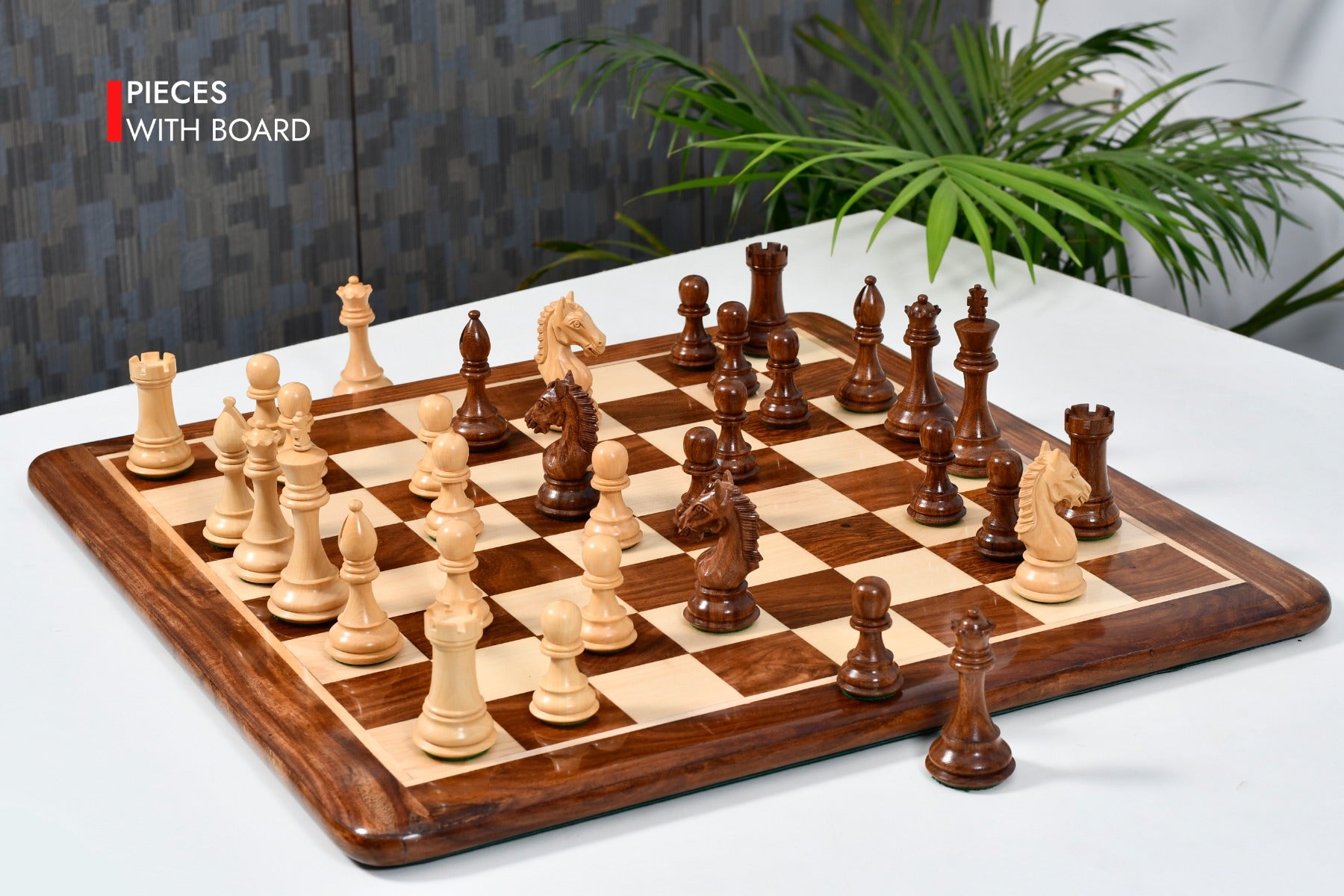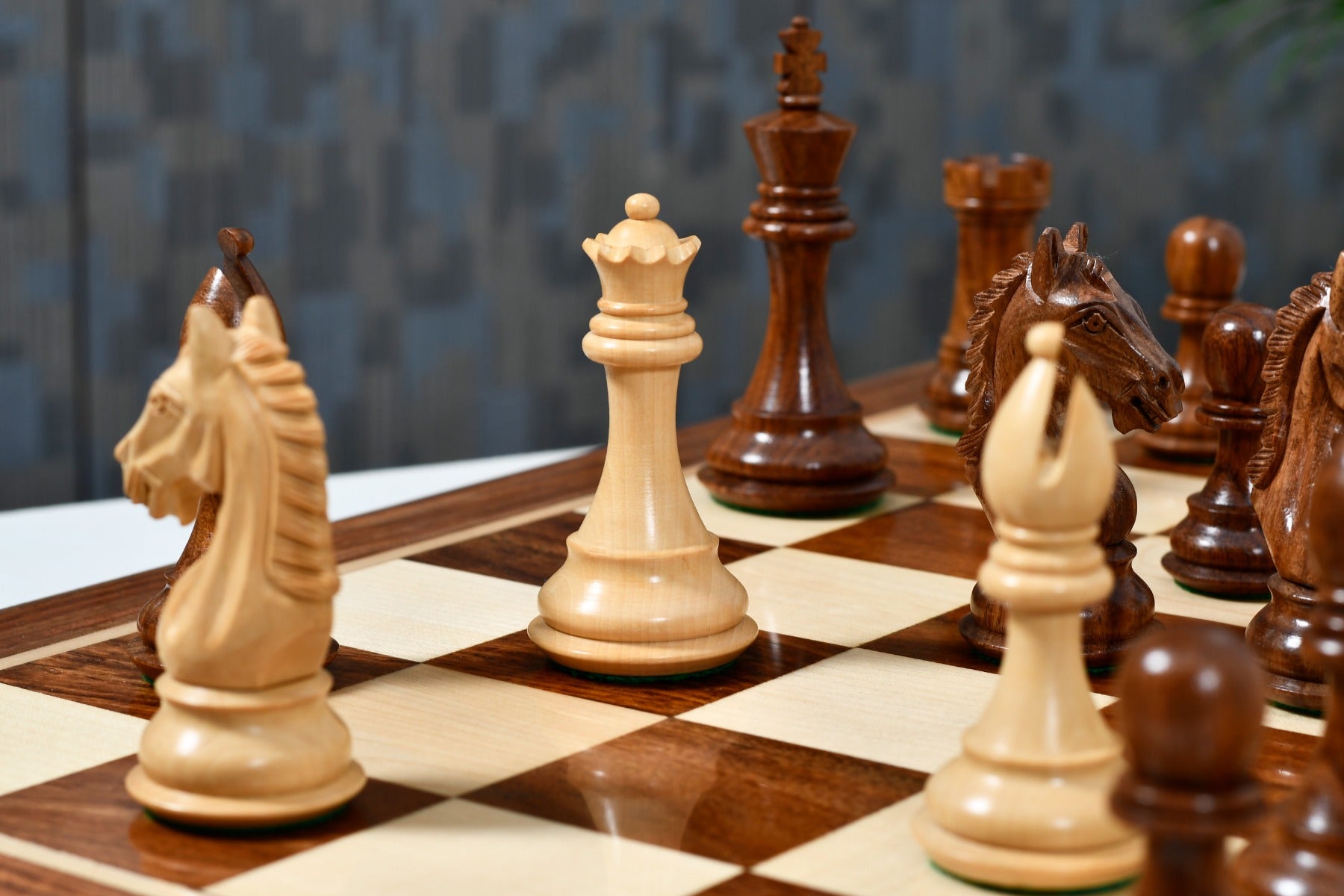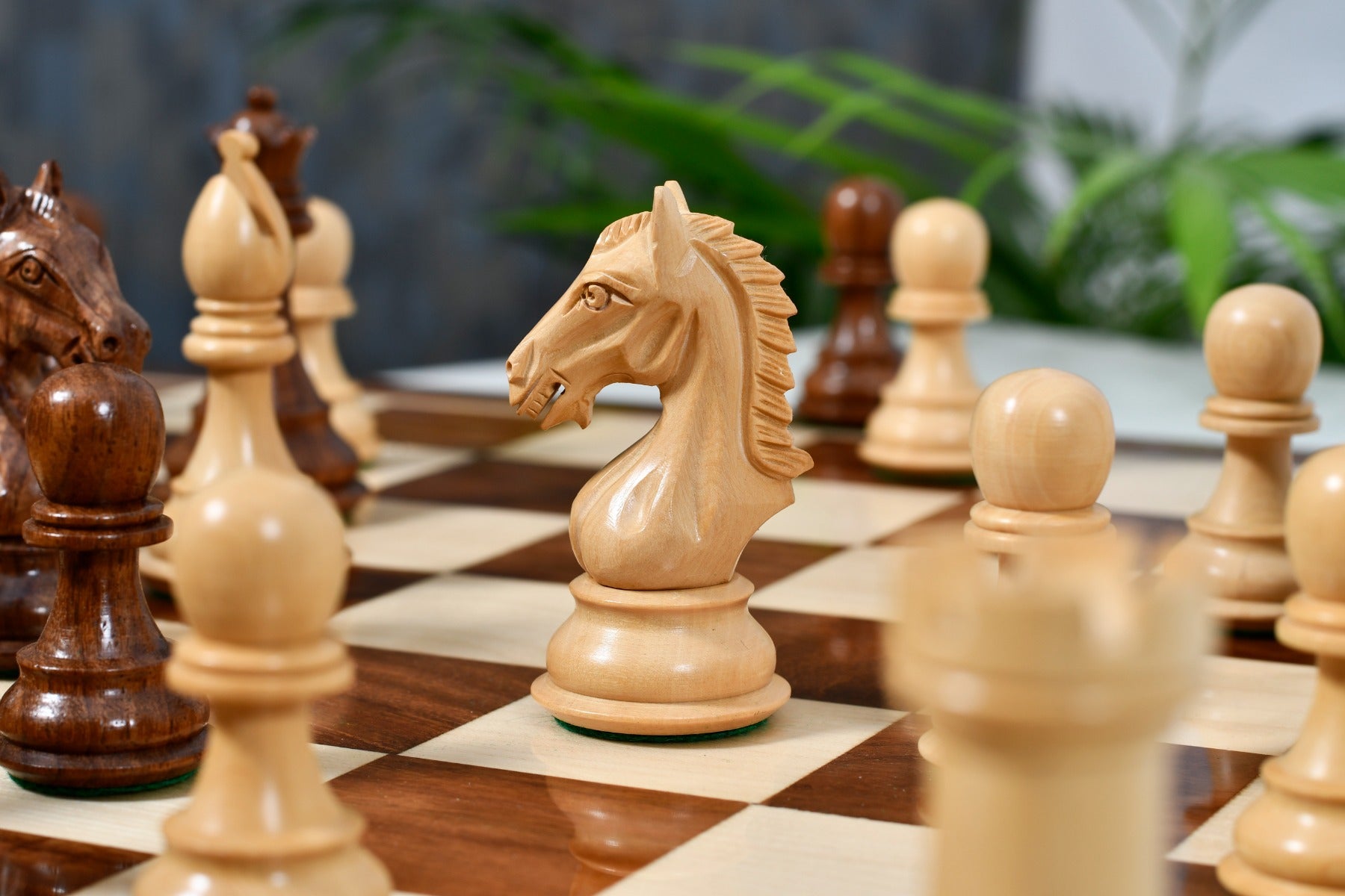 Features: The Derby Knight Series weighted chess pieces offers a 4.1" King with a diameter of 1.7" and all chess pieces are double weighted by adding a stud of iron within the base. Each of the chess pieces have thick green felt on their bases. The dark chess pieces are made of Sheesham and the lighter chess pieces are made of Boxwood.