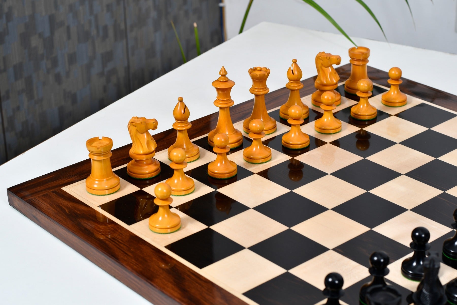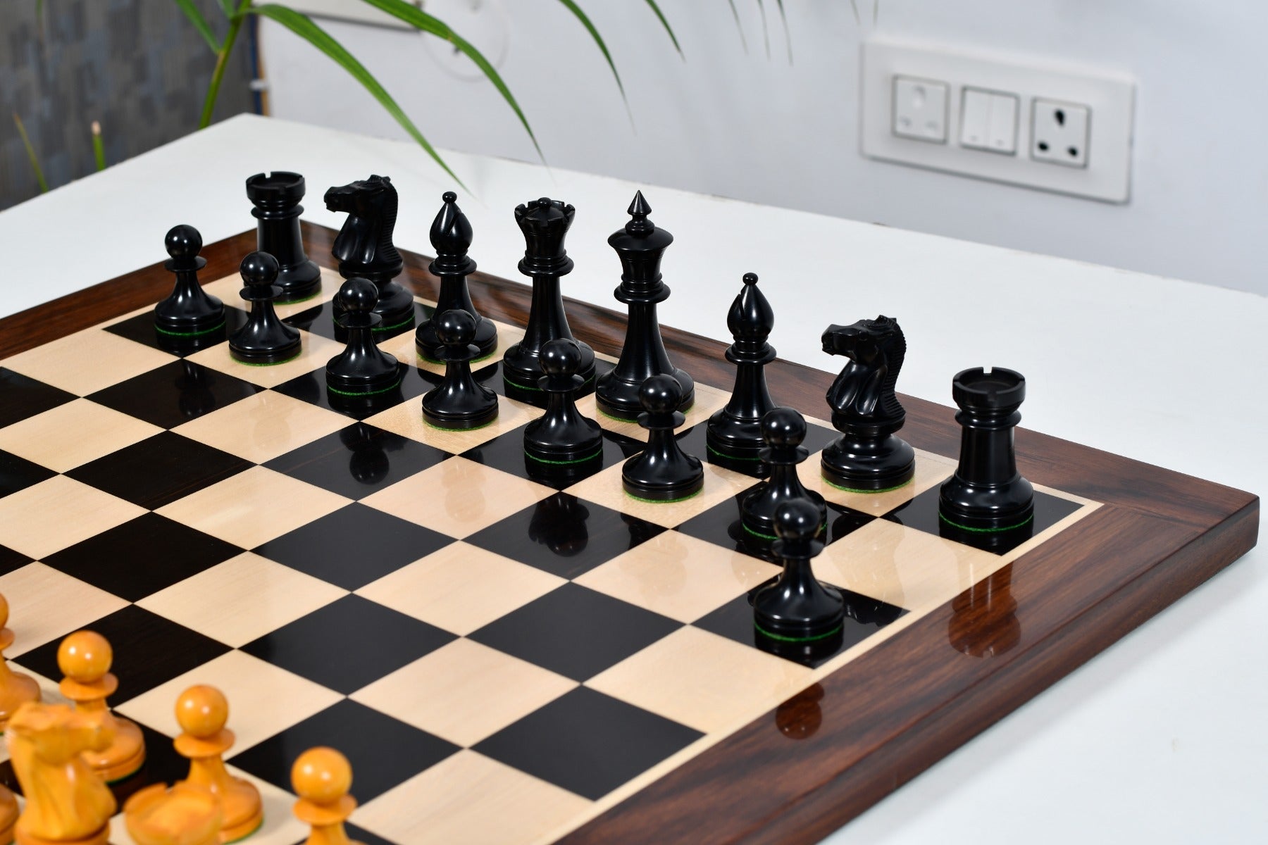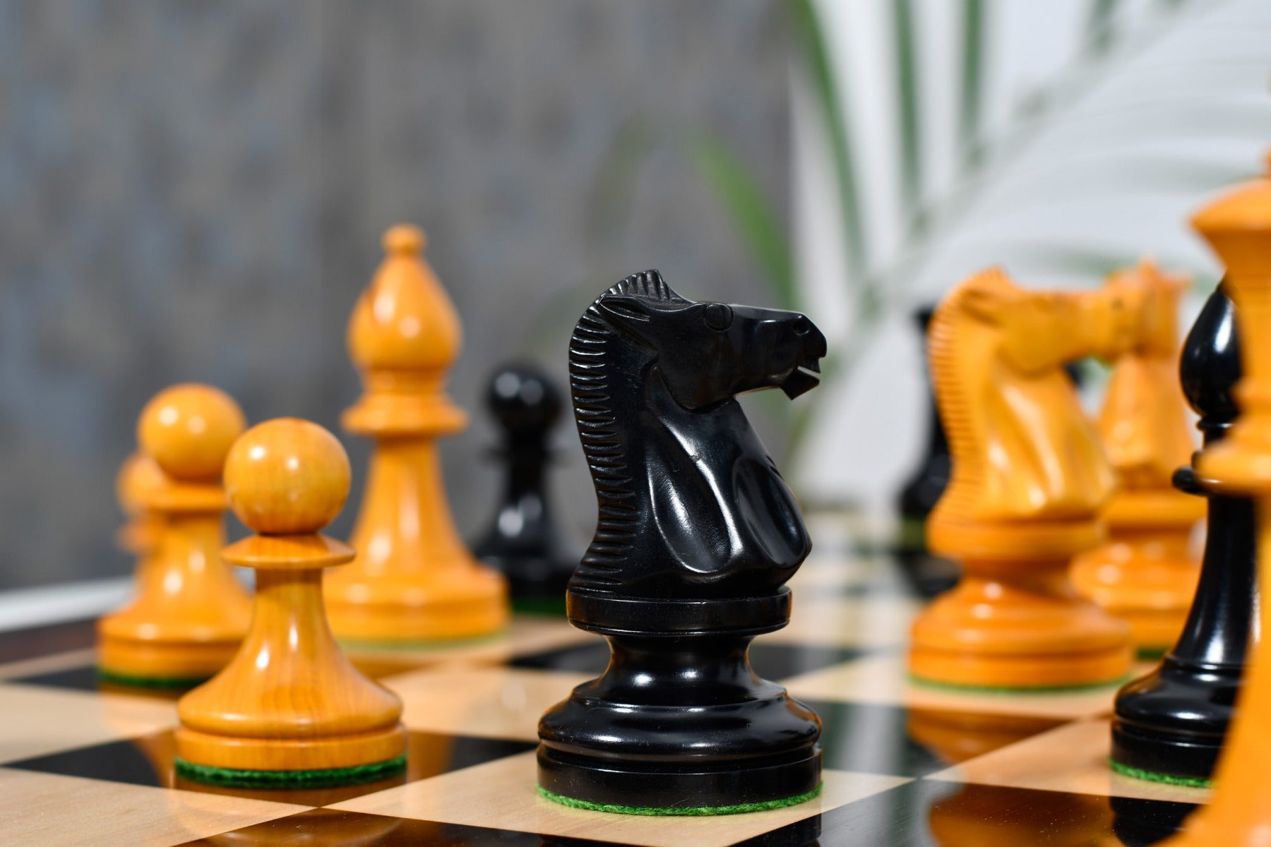 This peerless 1904 Cambridge Springs International Congress Tournament Chess Set in Staunton style is made of ebonized boxwood and antiqued boxwood. The King stands at 4 inches with a 1.7-inch base. This historic design features a unique king finial, a wider base, and superb size proportioning. The dark pieces are ebonized wood, while the opposing pieces are antiqued boxwood. The set includes free extra queens, thick green felt bases for smooth movement, and well-crafted knights showcasing Indian artisans' skills. Expertly carved in India, the pieces are heavily weighted for a premium feel.