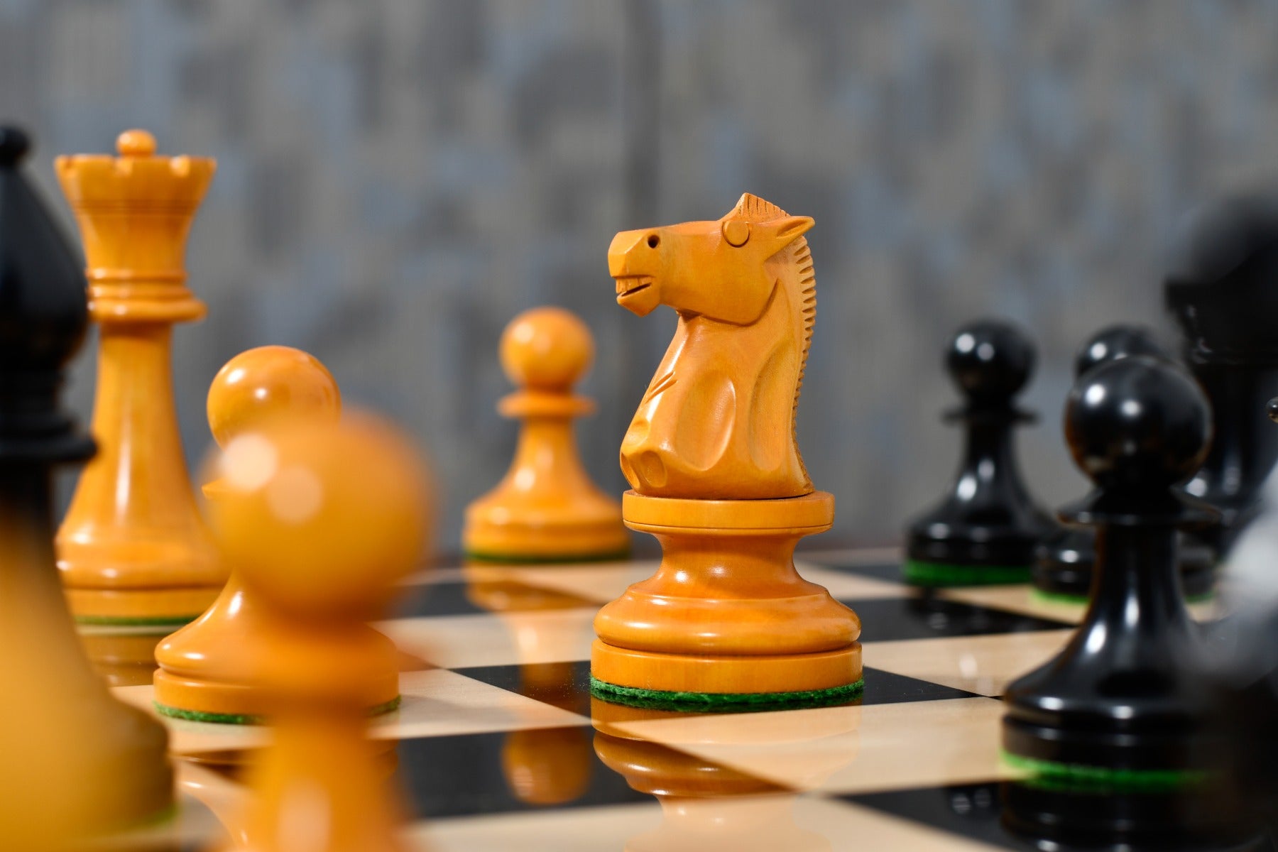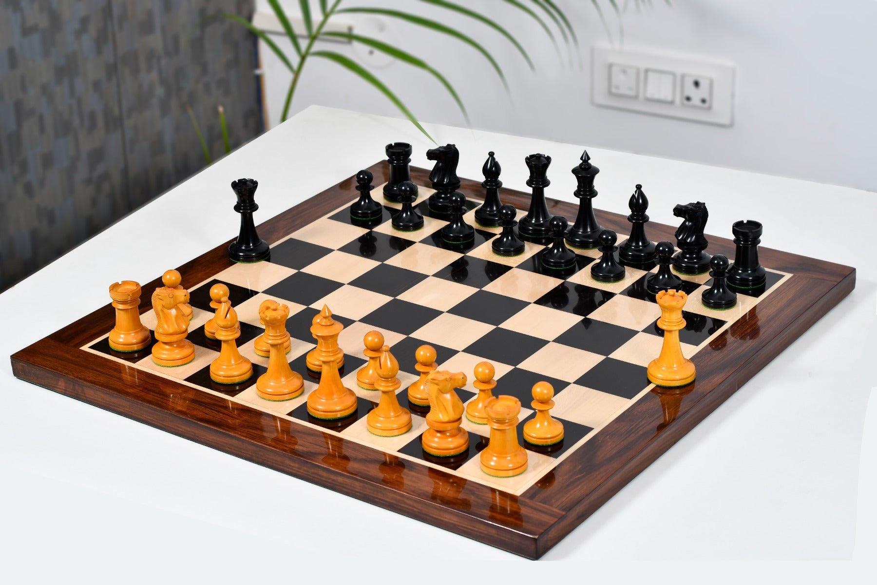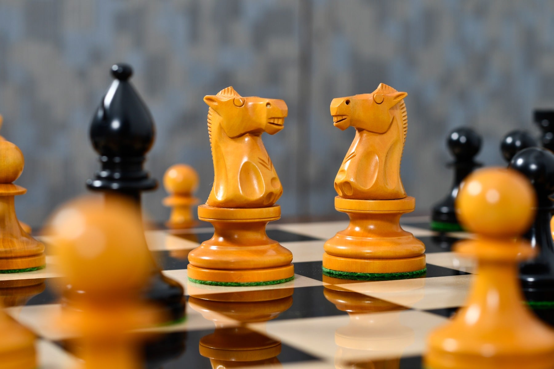This peerless 1904 Cambridge Springs International Congress Tournament Chess Set in Staunton style is made of ebonized boxwood and antiqued boxwood. The King stands at 4 inches with a 1.7-inch base. This historic design features a unique king finial, a wider base, and superb size proportioning. The dark pieces are ebonized wood, while the opposing pieces are antiqued boxwood. The set includes free extra queens, thick green felt bases for smooth movement, and well-crafted knights showcasing Indian artisans' skills. Expertly carved in India, the pieces are heavily weighted for a premium feel.