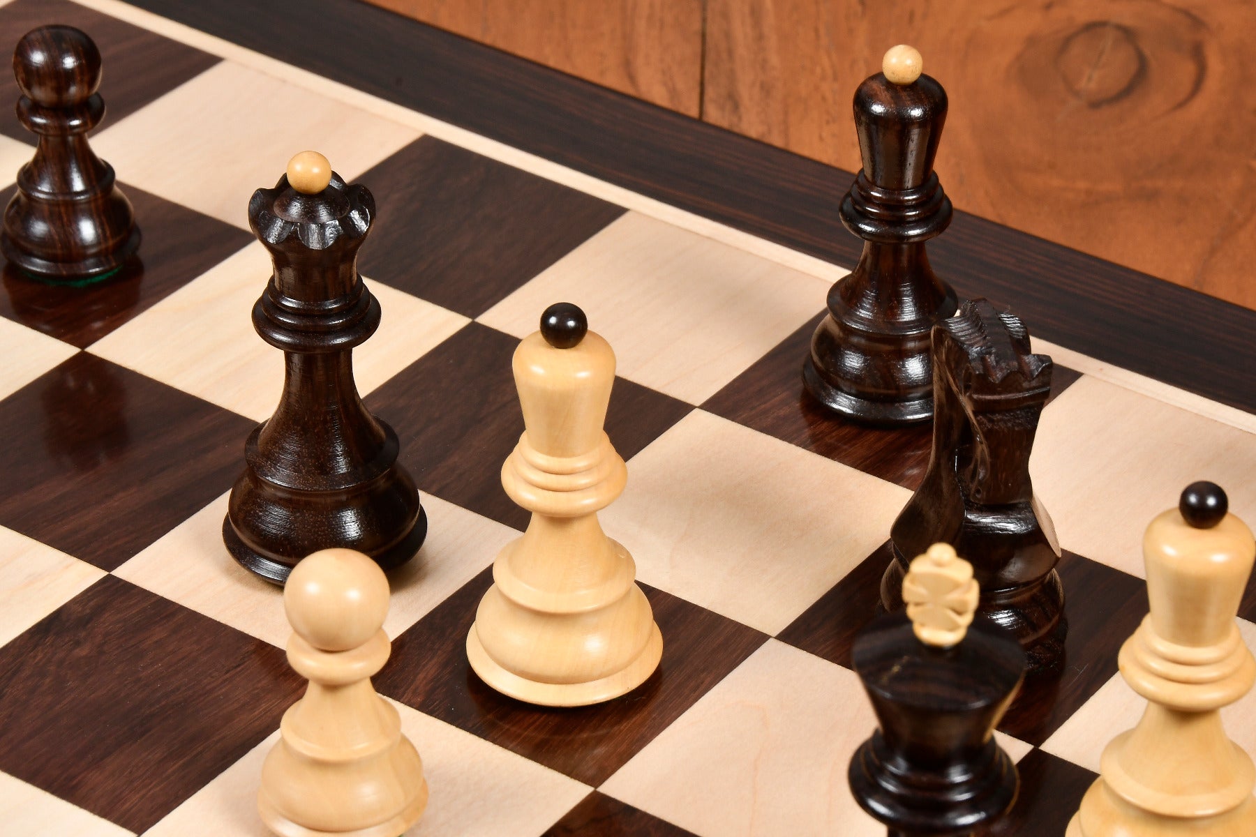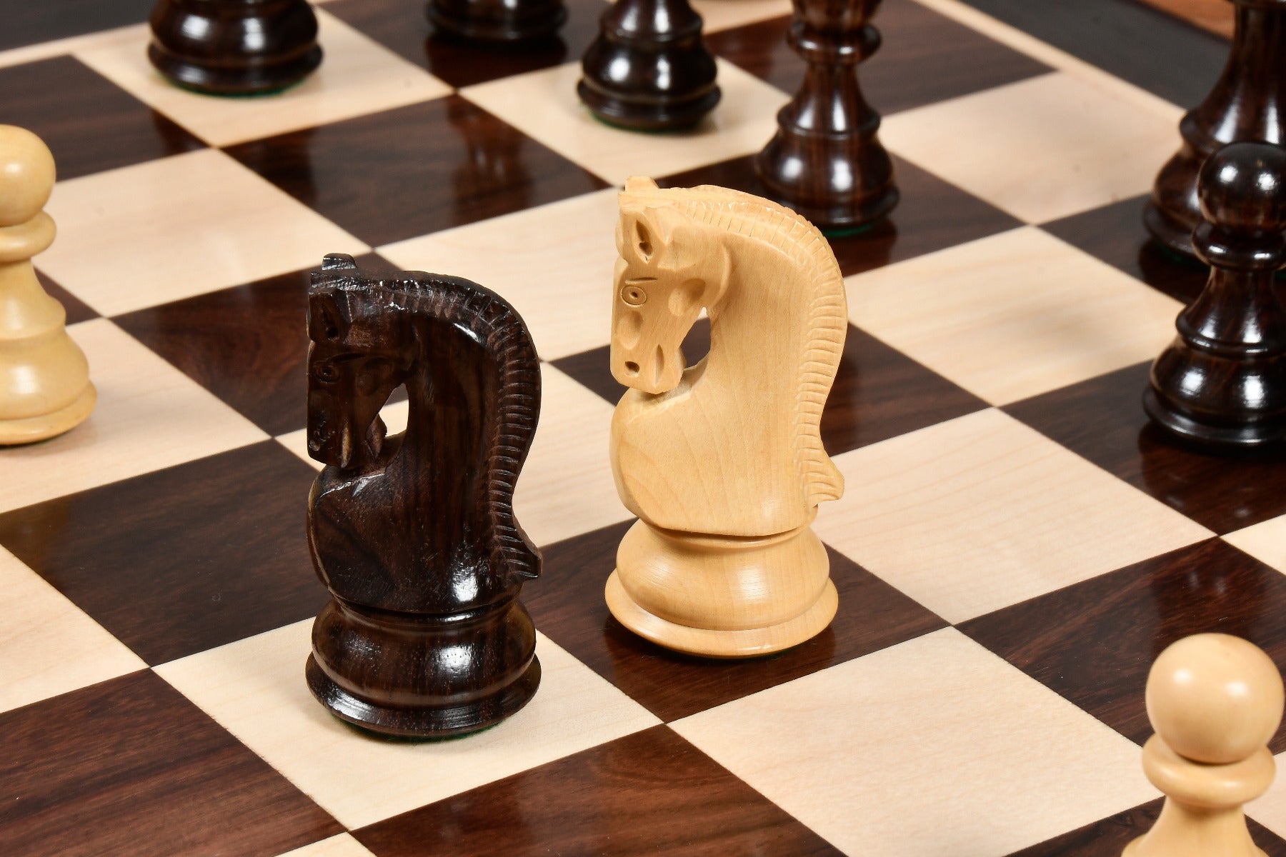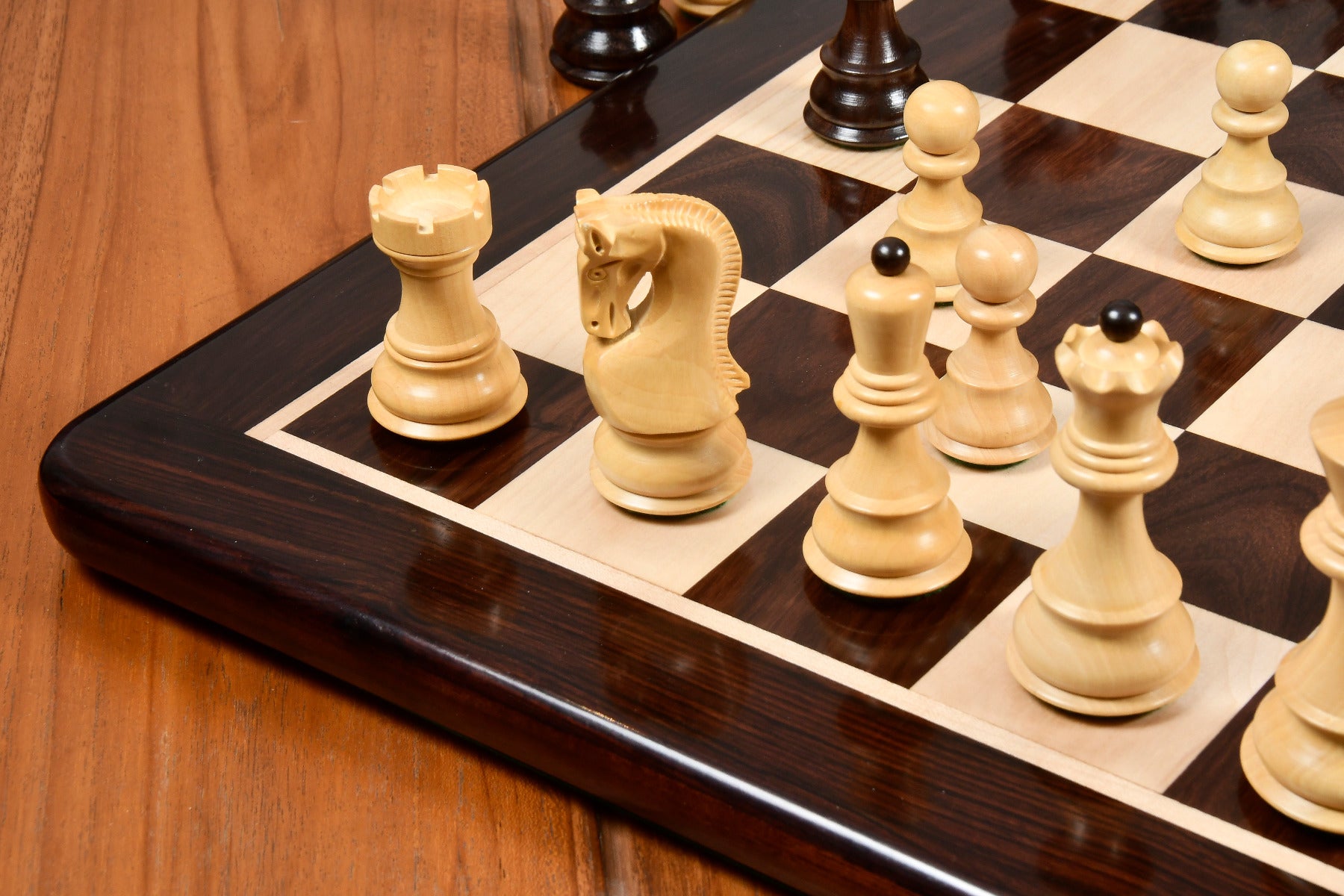 Reproduced 1959 Russian Zagreb Series chess set in Staunton style is made up of rosewood and natural boxwood. The King proudly stands at 3.8 inches and its base is a robust 1.6 inches. Wider base and superb size proportioning from the king to the pawn exhibits true intricate craftsmanship in all the pieces. .