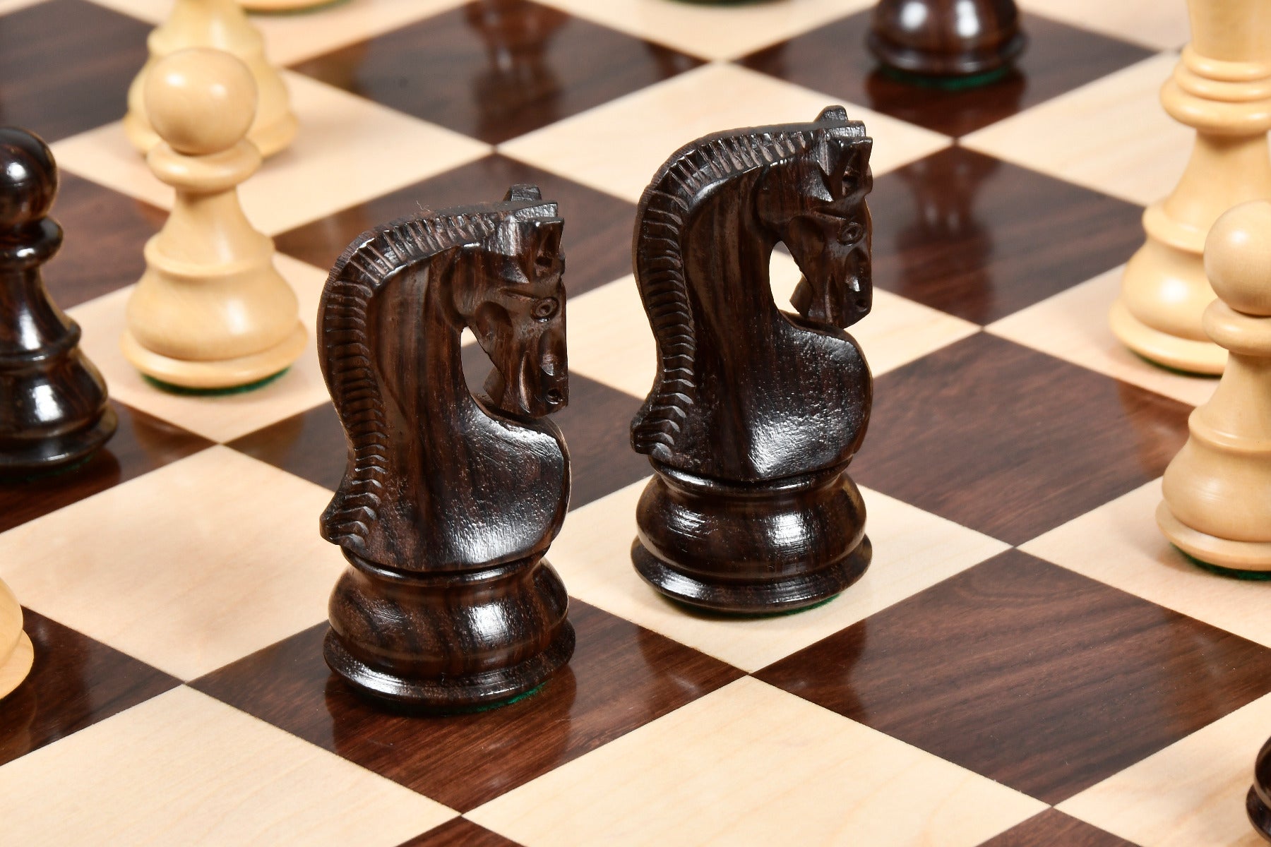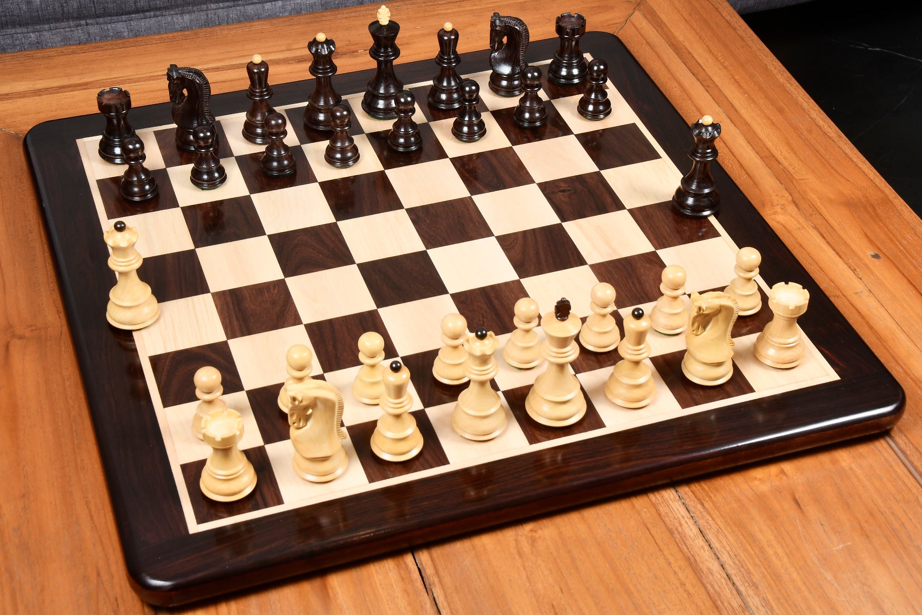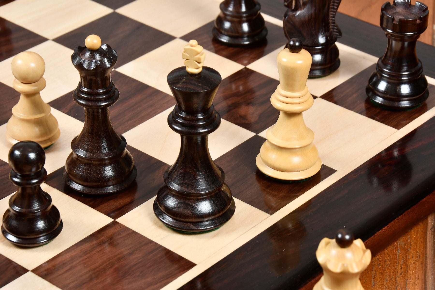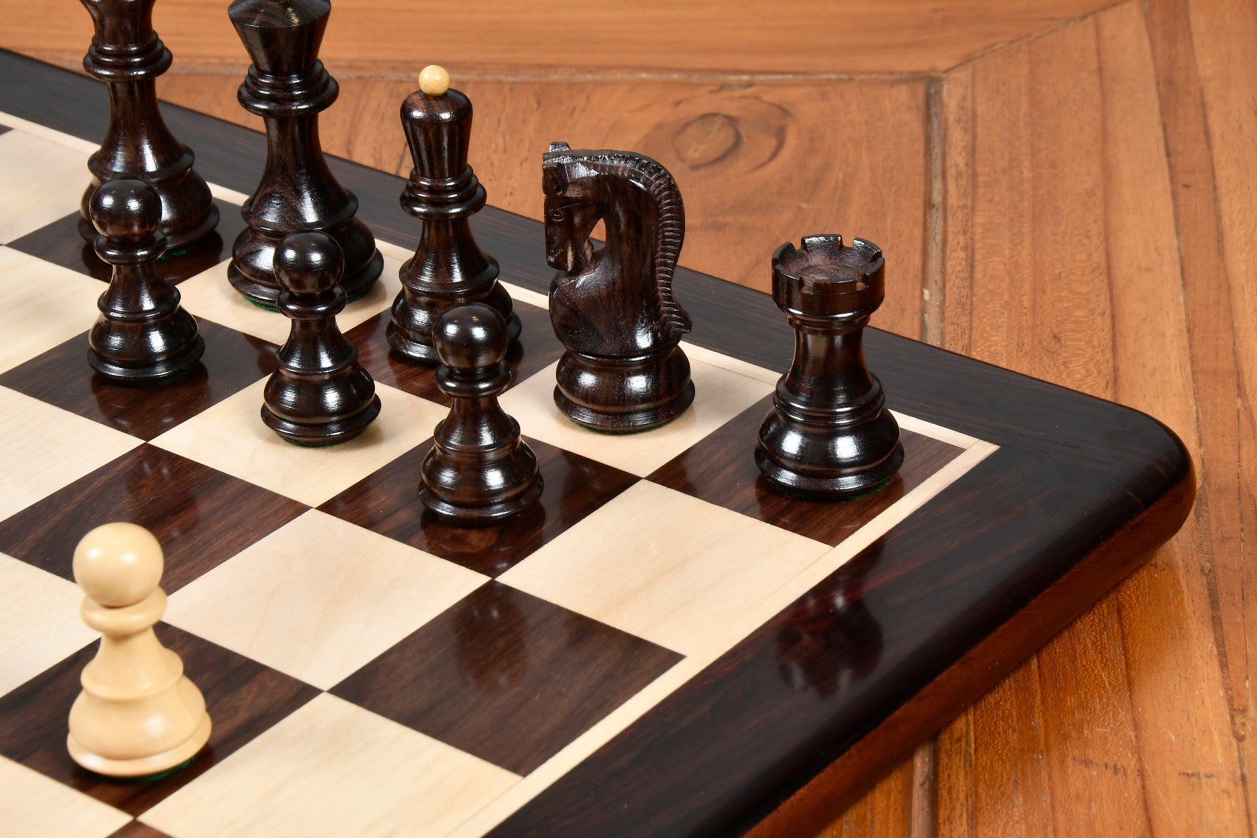Reproduced 1959 Russian Zagreb Series chess set in Staunton style is made up of rosewood and natural boxwood. The King proudly stands at 3.8 inches and its base is a robust 1.6 inches. Wider base and superb size proportioning from the king to the pawn exhibits true intricate craftsmanship in all the pieces. .