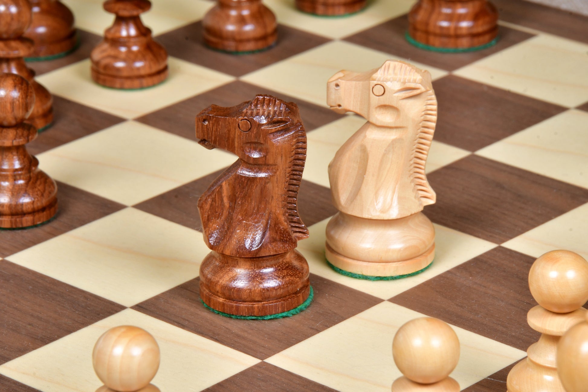 This Reykjavik Championship Series chess set in Staunton style is made up of sheesham and boxwood. The King proudly stands at 3.7 inches and its base is a robust 1.6 inches. Wider base and superb size proportioning from the king to the pawn exhibits true intricate craftsmanship in all the pieces. Dark chess pieces are exquisitely crafted in sheesham wood. All Chess pieces are expertly carved in India and weighted for prodigious hand-feel and a very nice thud on the wooden chess board.