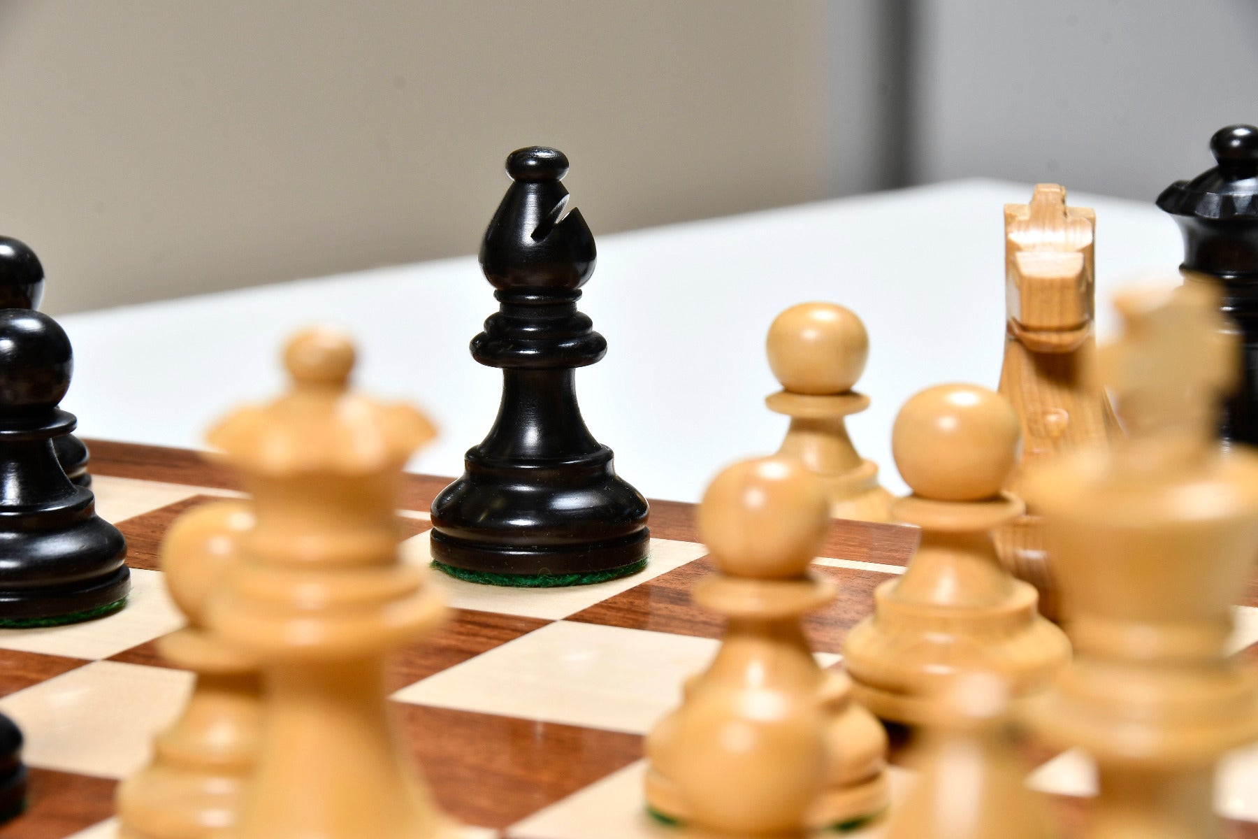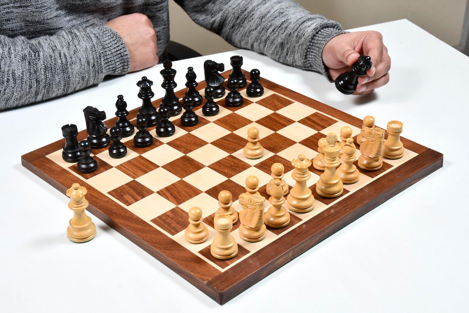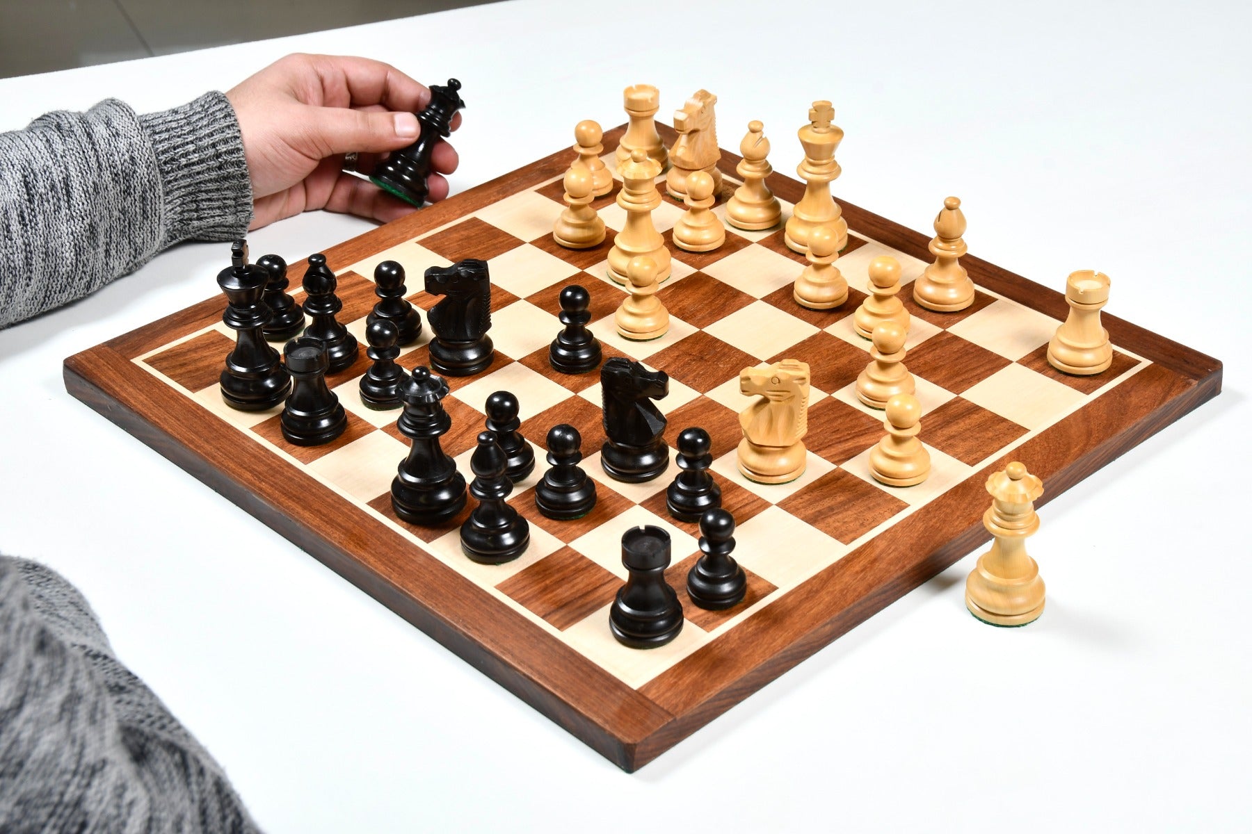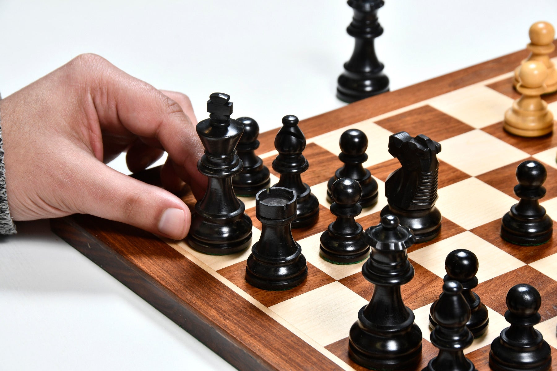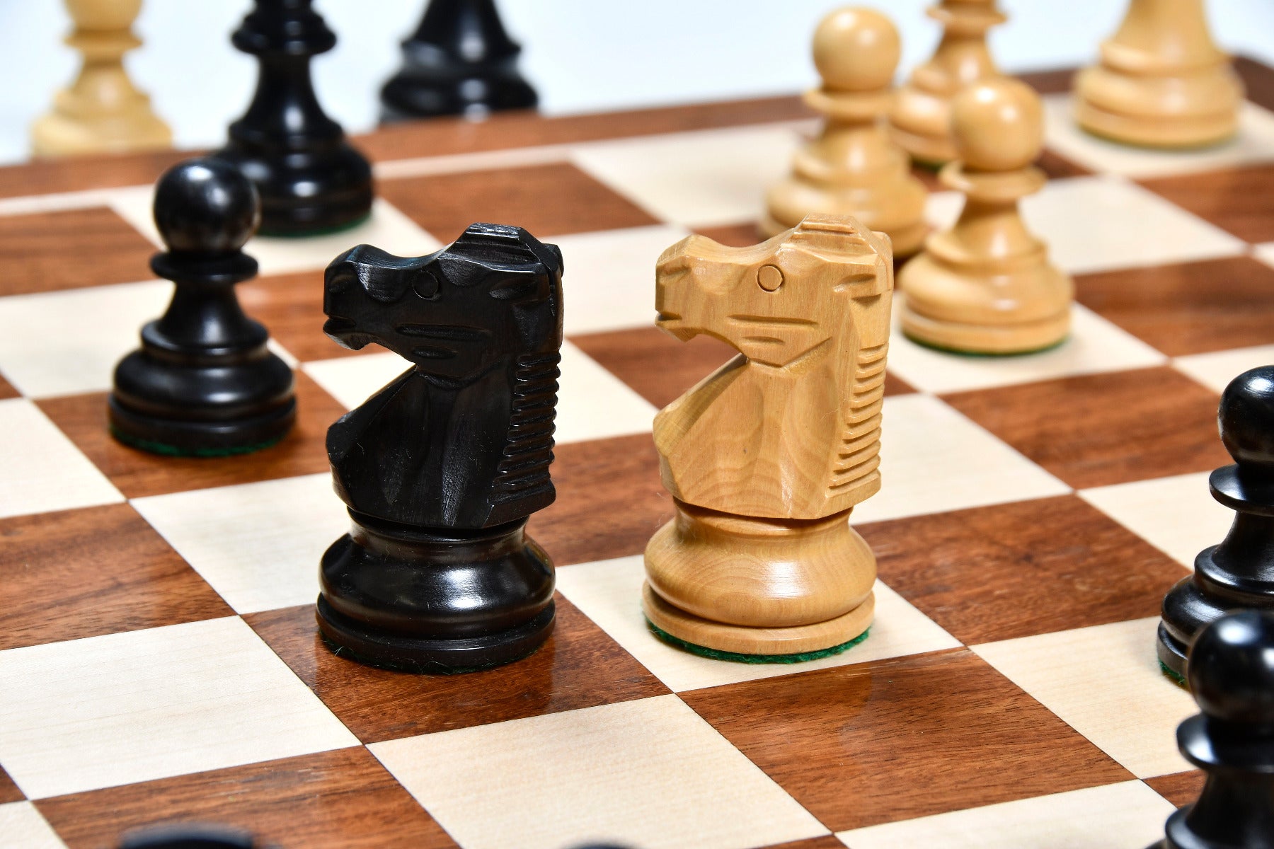 Handcrafted in India, these French Lardy Staunton chess pieces offer a traditional design with a 3.0" King and a weighted base for stability. Each piece is carefully hand-carved, polished, and finished with green felt to protect the board. The set’s quality and craftsmanship make it ideal for both casual play and tournaments.