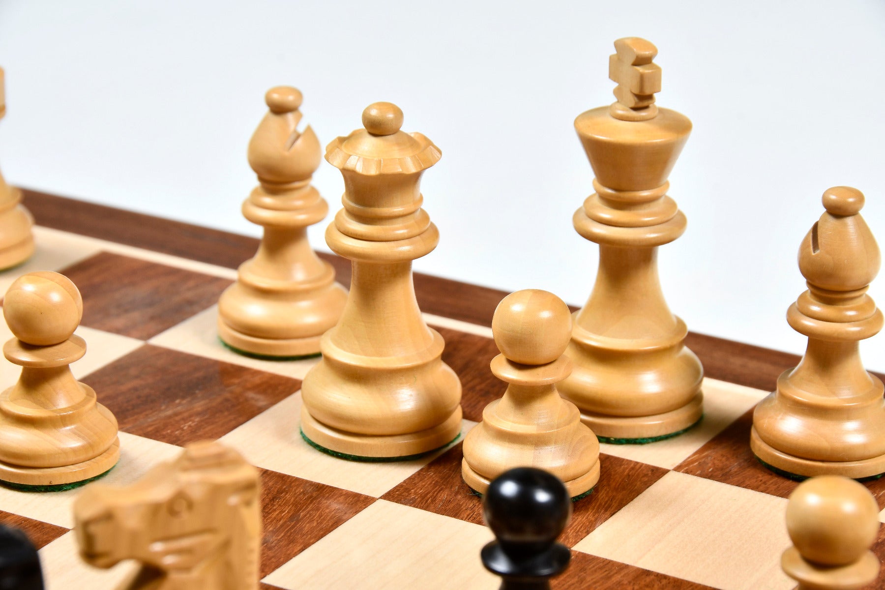 Features : Reproduced French Lardy Staunton weighted chess pieces with a 3.0" King and base diameter of 1.2" and have thick green felt on their bases. This set is Weighted and is based on the original chess set made by the Lardy Chess Company in France. The dark chess pieces are made in Ebonized Boxwood and the lighter chess pieces are made in Boxwood.