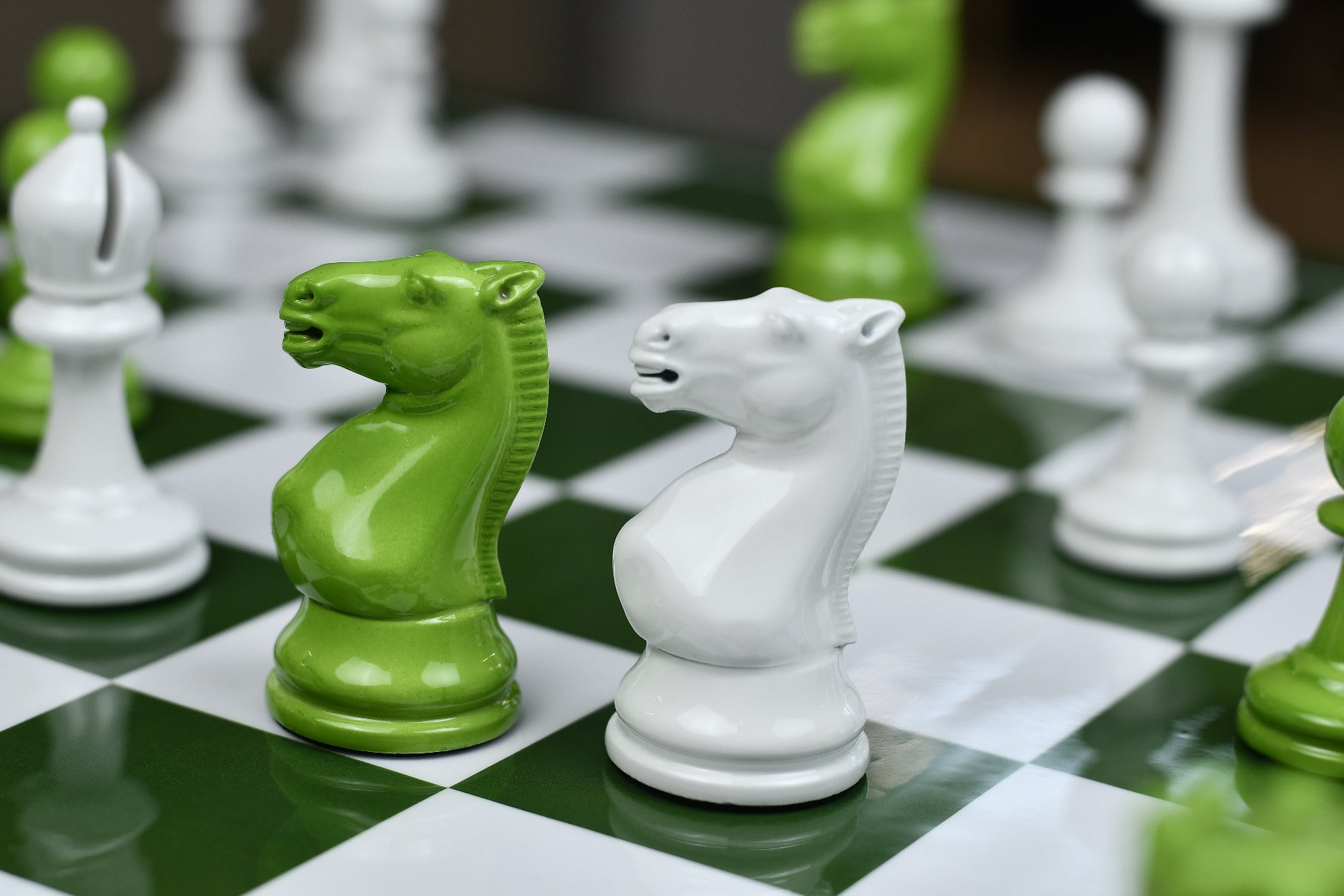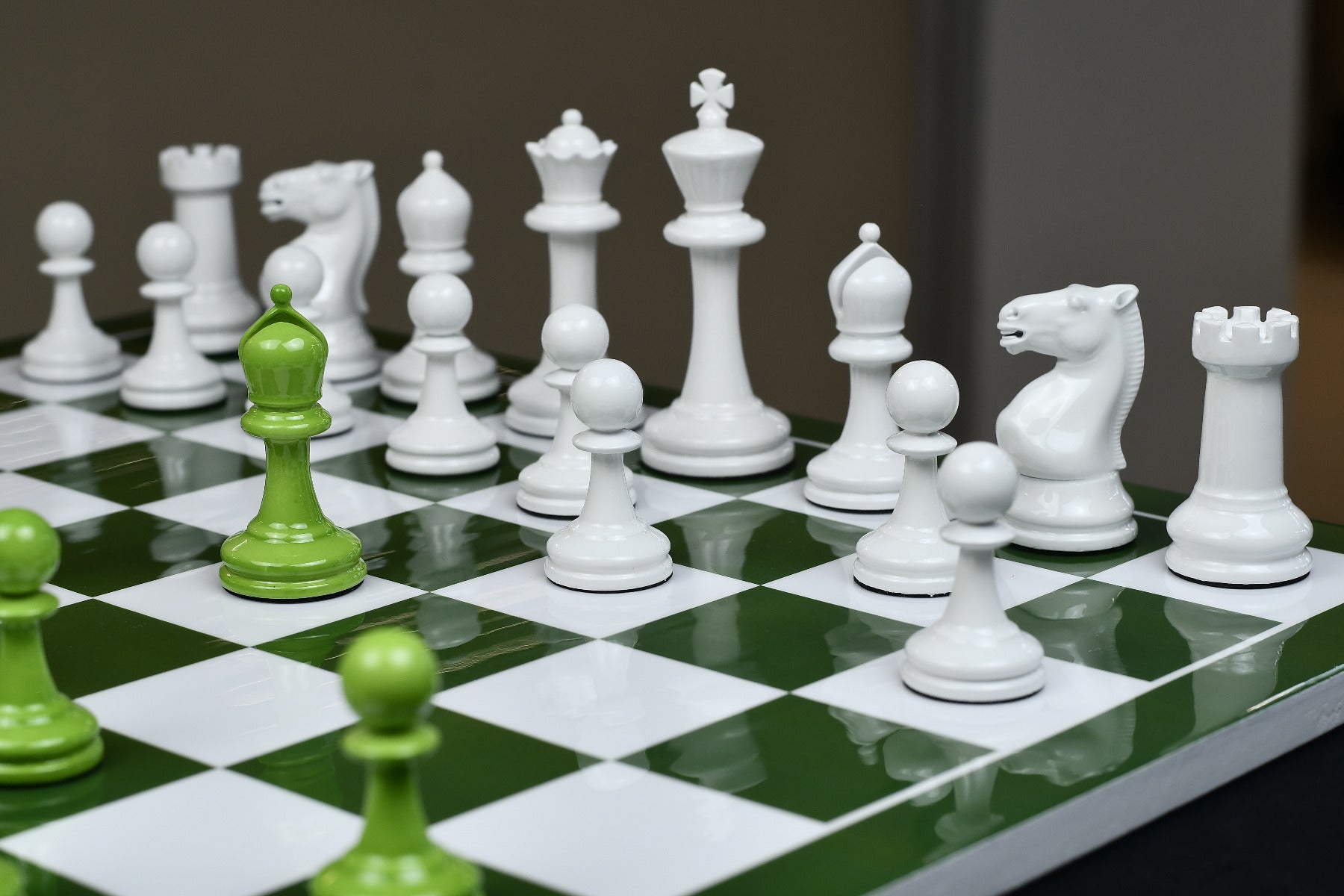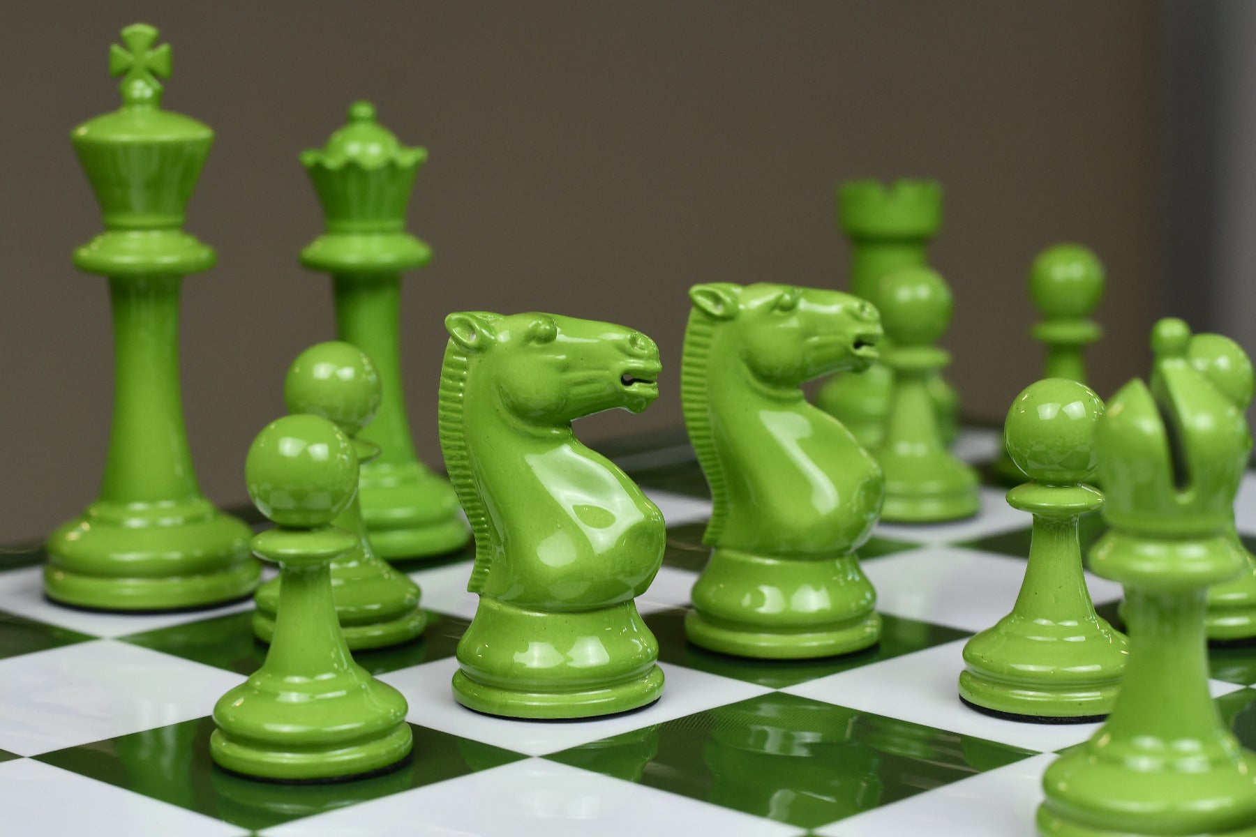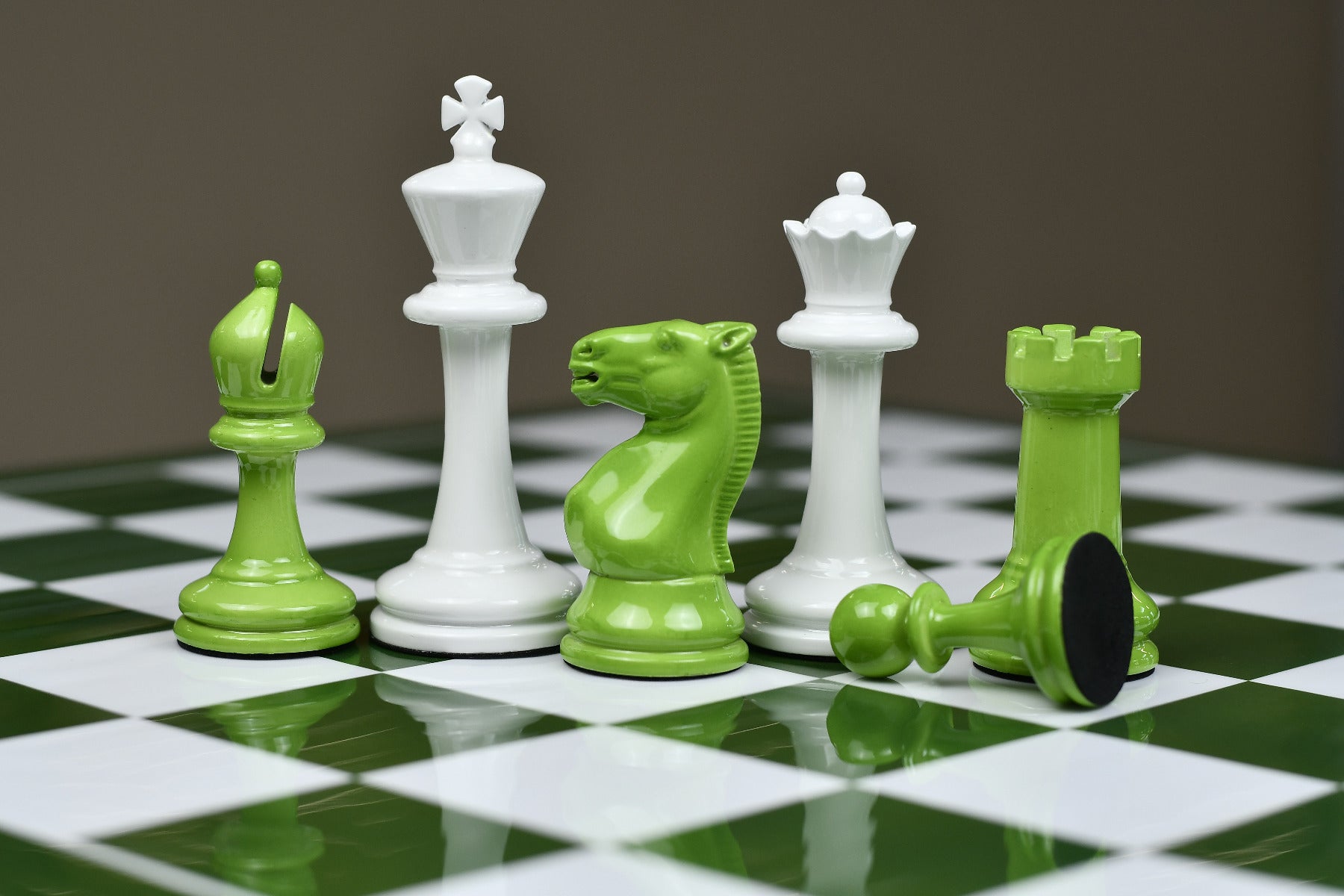 Shamrock Chess Set Painted in Vivid Irish Green & White Plastic - 3.75" King with Board