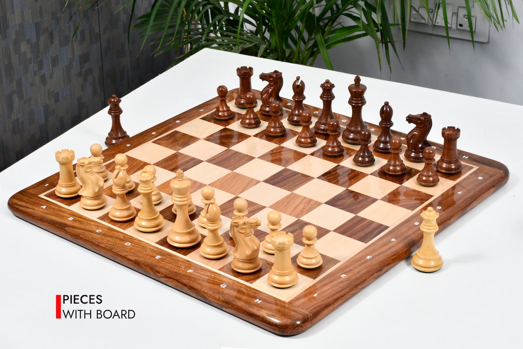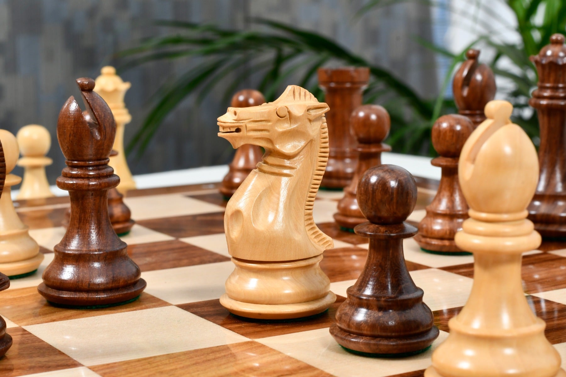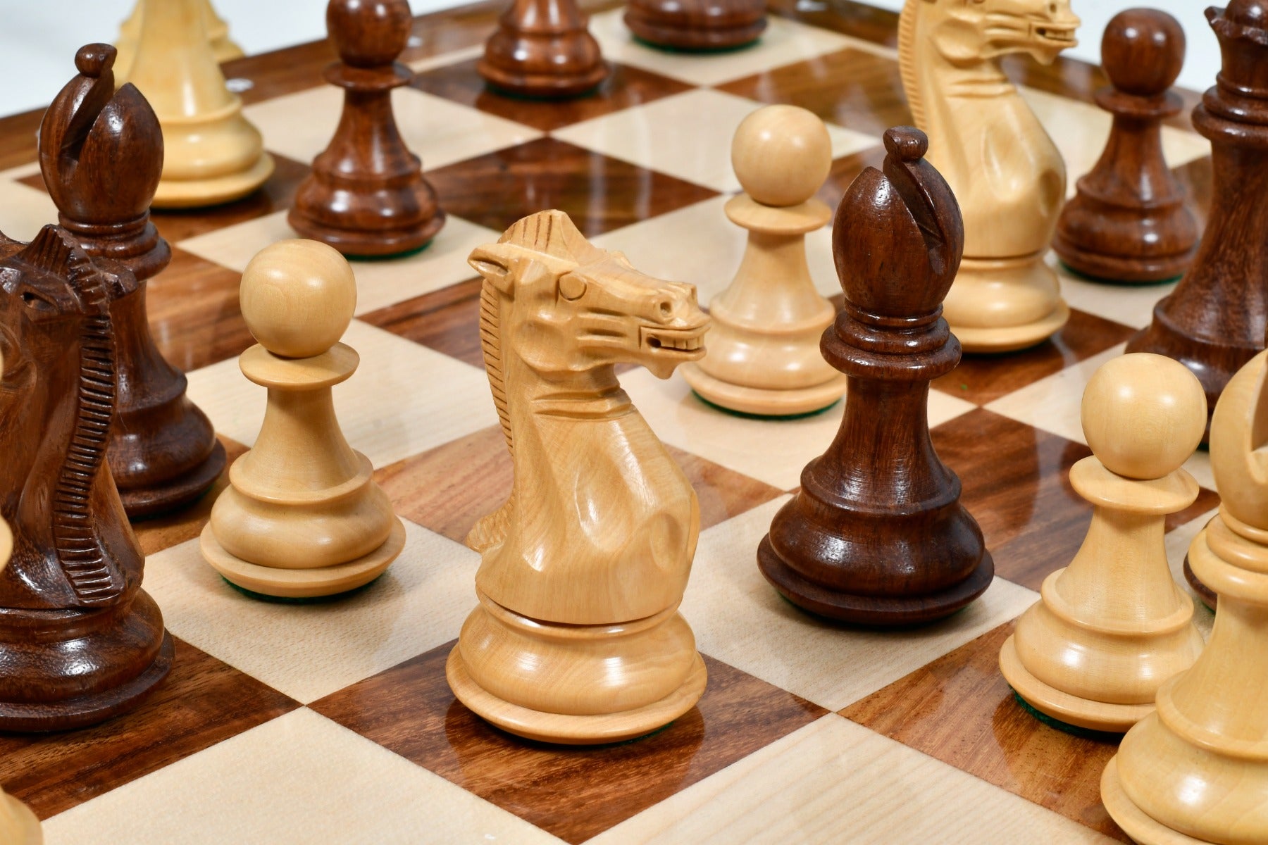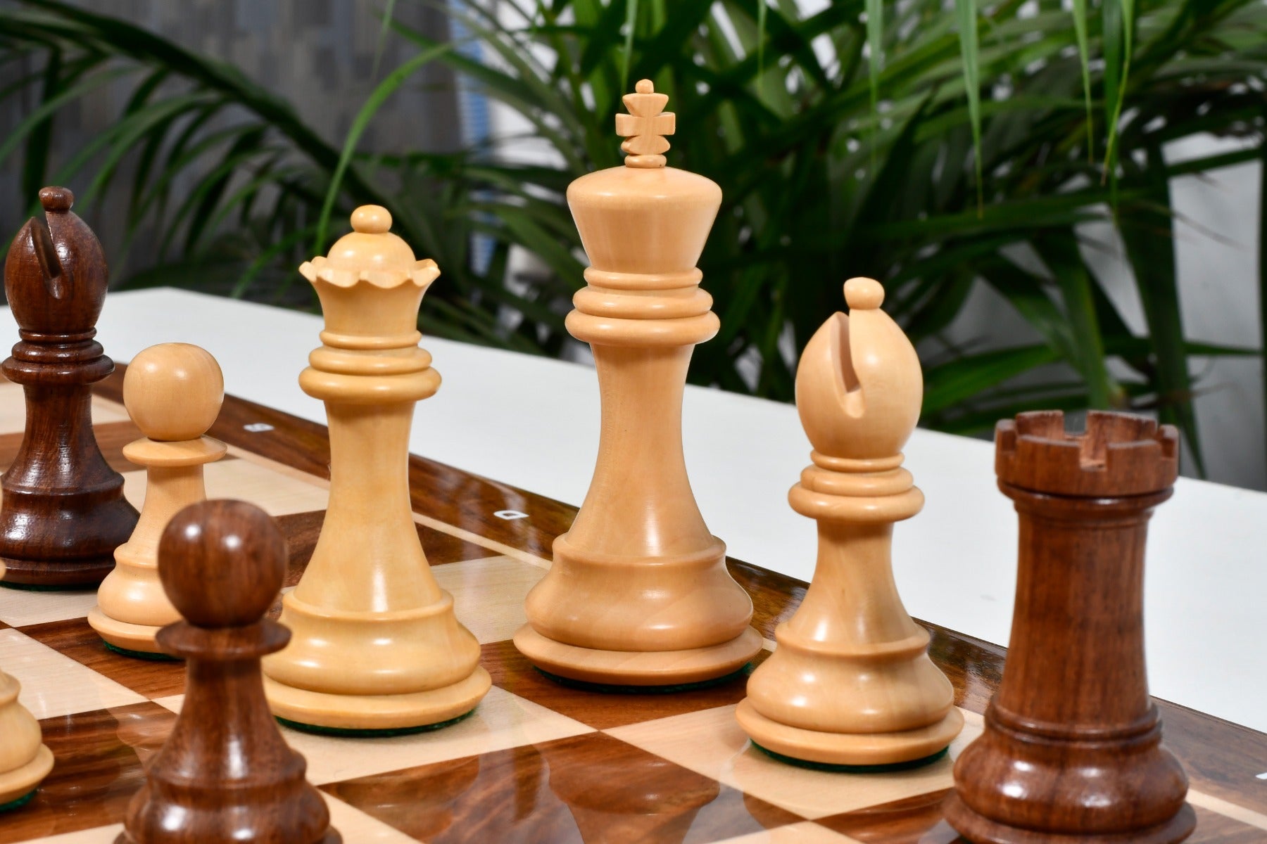 The Honour of Staunton (HOS) Series is made up of Sheesham and boxwood. The King proudly stands at 4.0 inches and its base is robust 1.9 inches. The dark chess pieces are made of sheesham and the opposing pieces are made up of boxwood which is traditionally used for white side. The set comes with free extra queens for effortless pawn promotion.