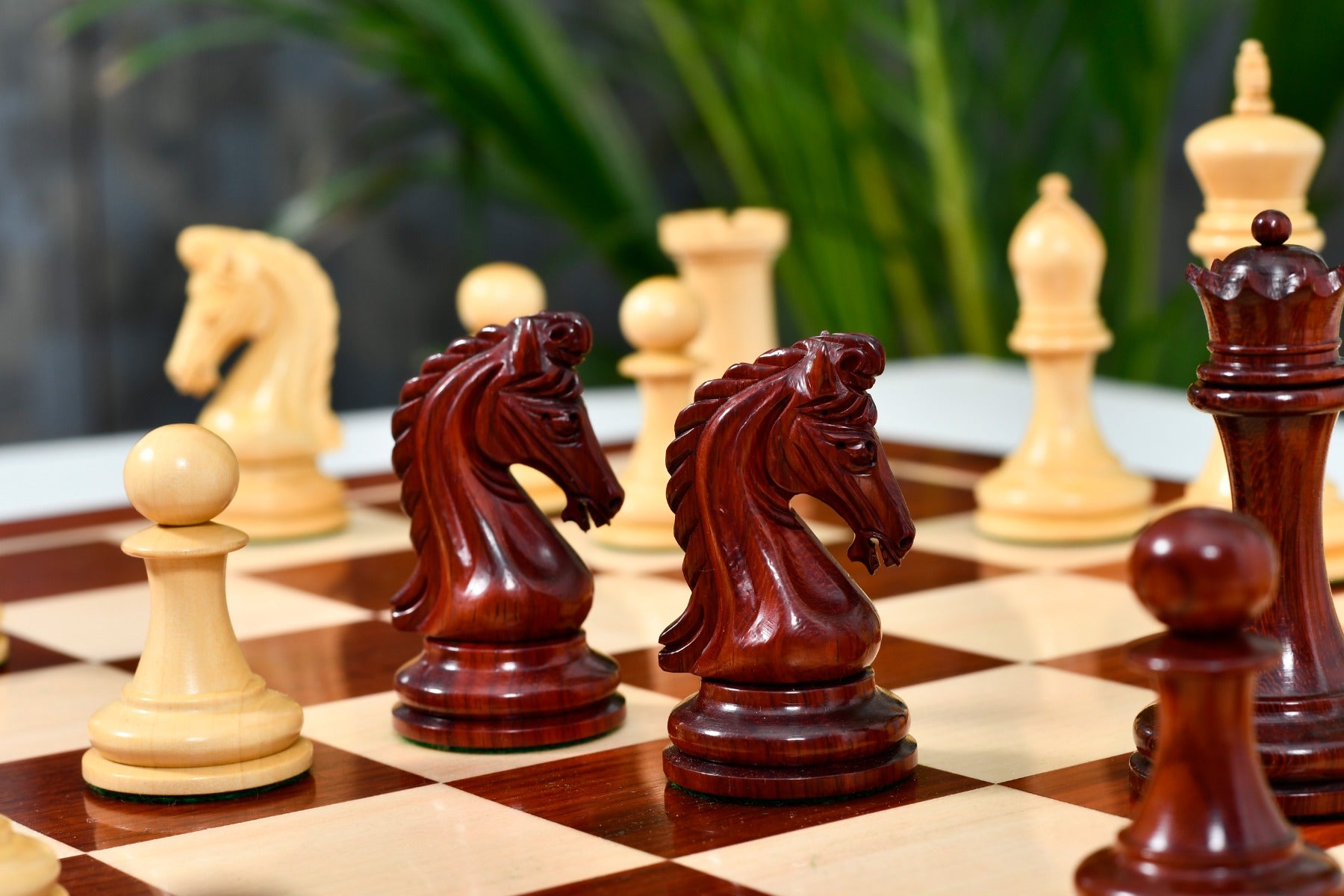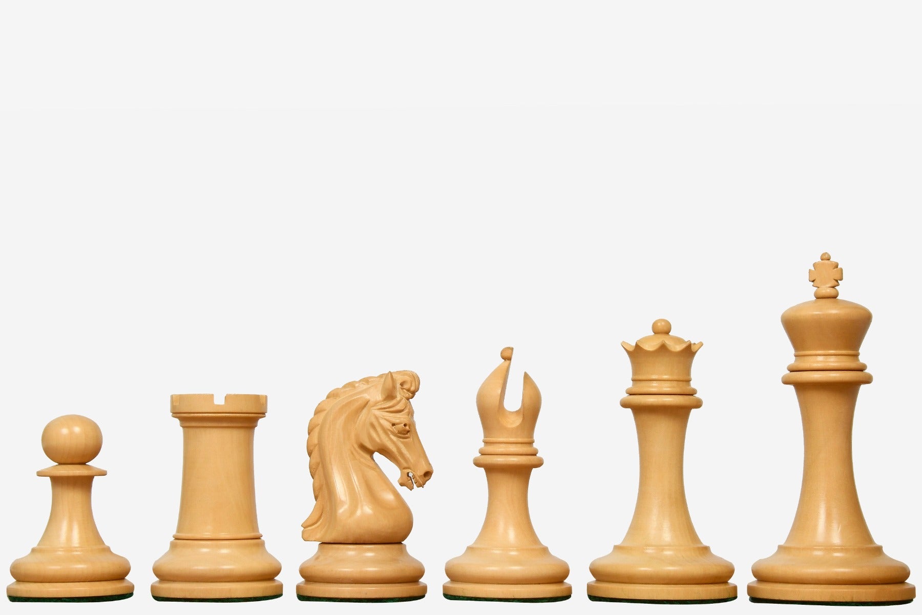 The opposing pieces are made of boxwood which is traditionally used for white side. It is one of the fairly easy woods to work with and shows off aesthetic detail. The set comes with free extra queens for effortless pawn promotion. All chess pieces are expertly carved and weighted for fantastic hand-feel and a very nice thud on the wooden chess board. King, Queens, Bishops, and Pawns have unique rings and thick green felts, which precisely envelops the base of each chessmen for smooth movement on the chess board. The lathe work on each chess piece is noteworthy, especially the unique collar rings and elegant curves.