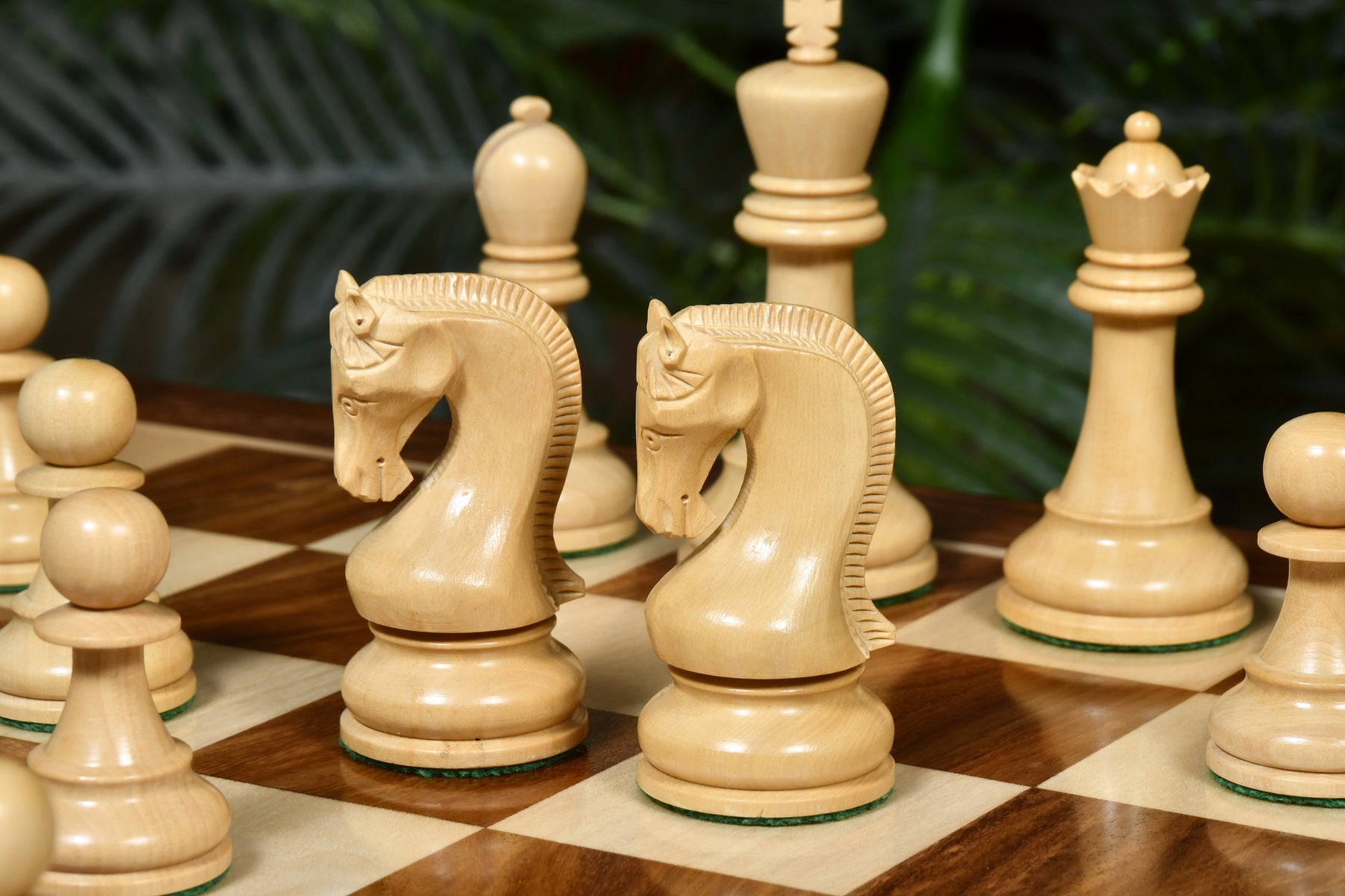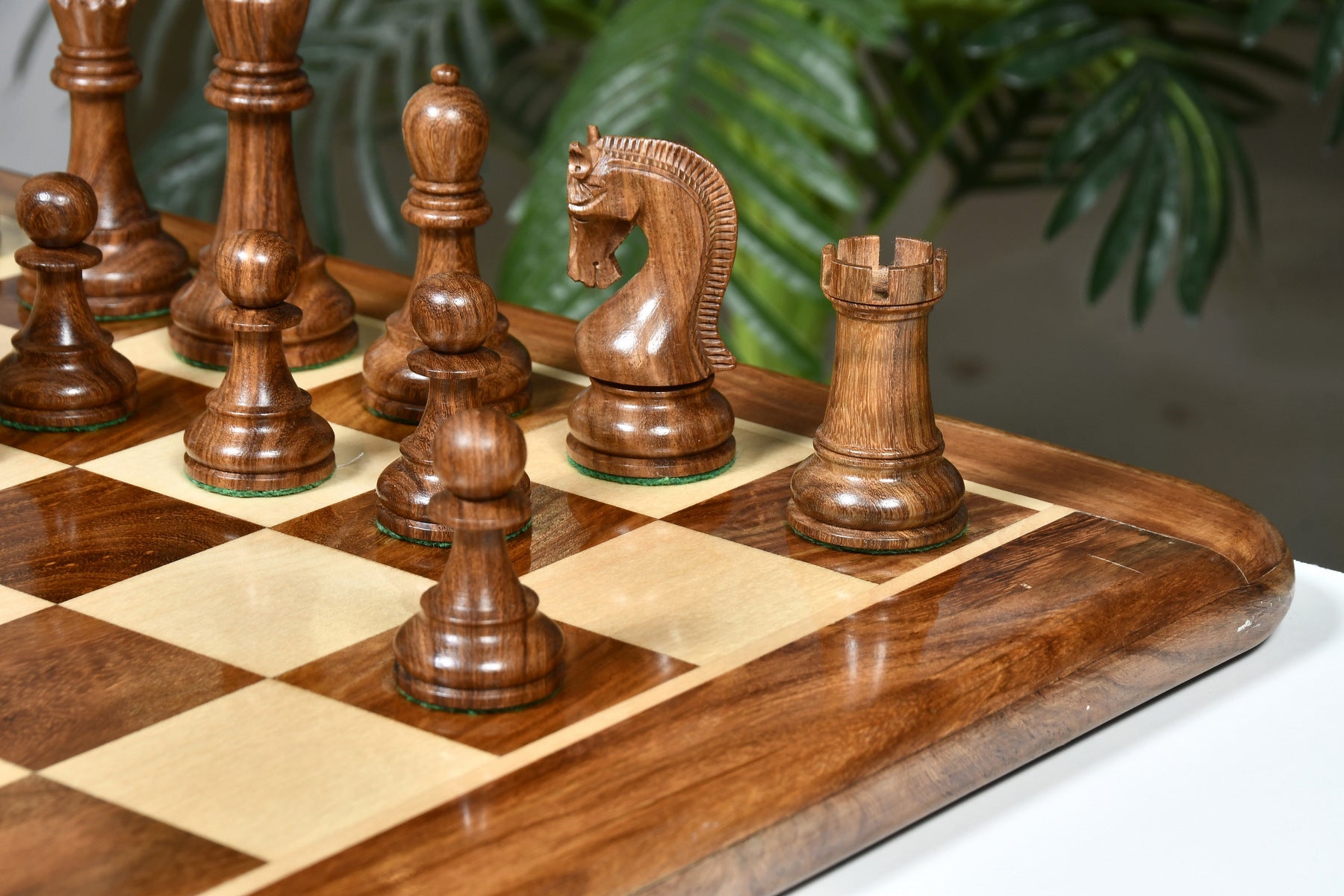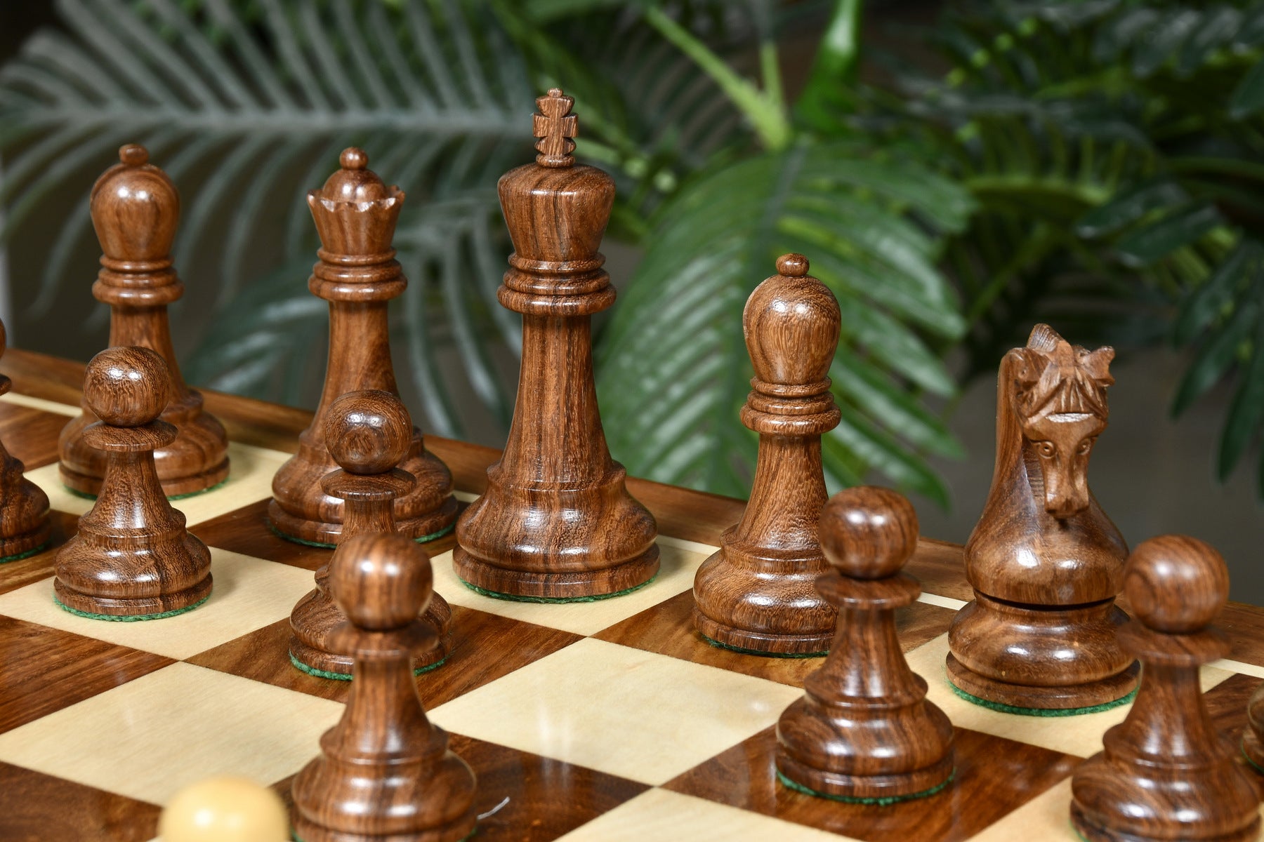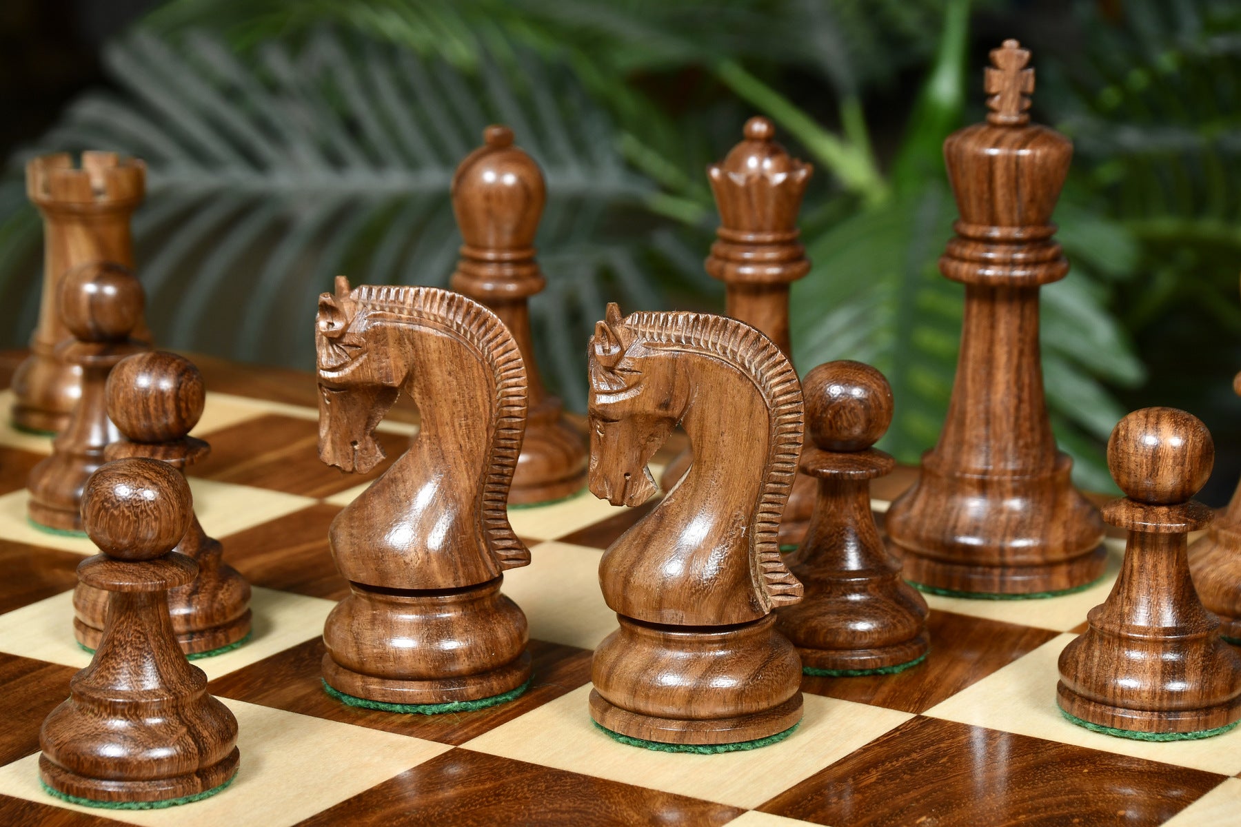 This premium chess set features Sheesham Wood for dark pieces and boxwood for the white. The King stands at 4.0 inches with a 1.6-inch base. Sheesham Wood offers a luxurious texture, and all pieces are expertly carved, triple-weighted, and fitted with thick green felt for smooth movement. Extra queens are included for easy pawn promotion, and the knights showcase masterful carving skills.