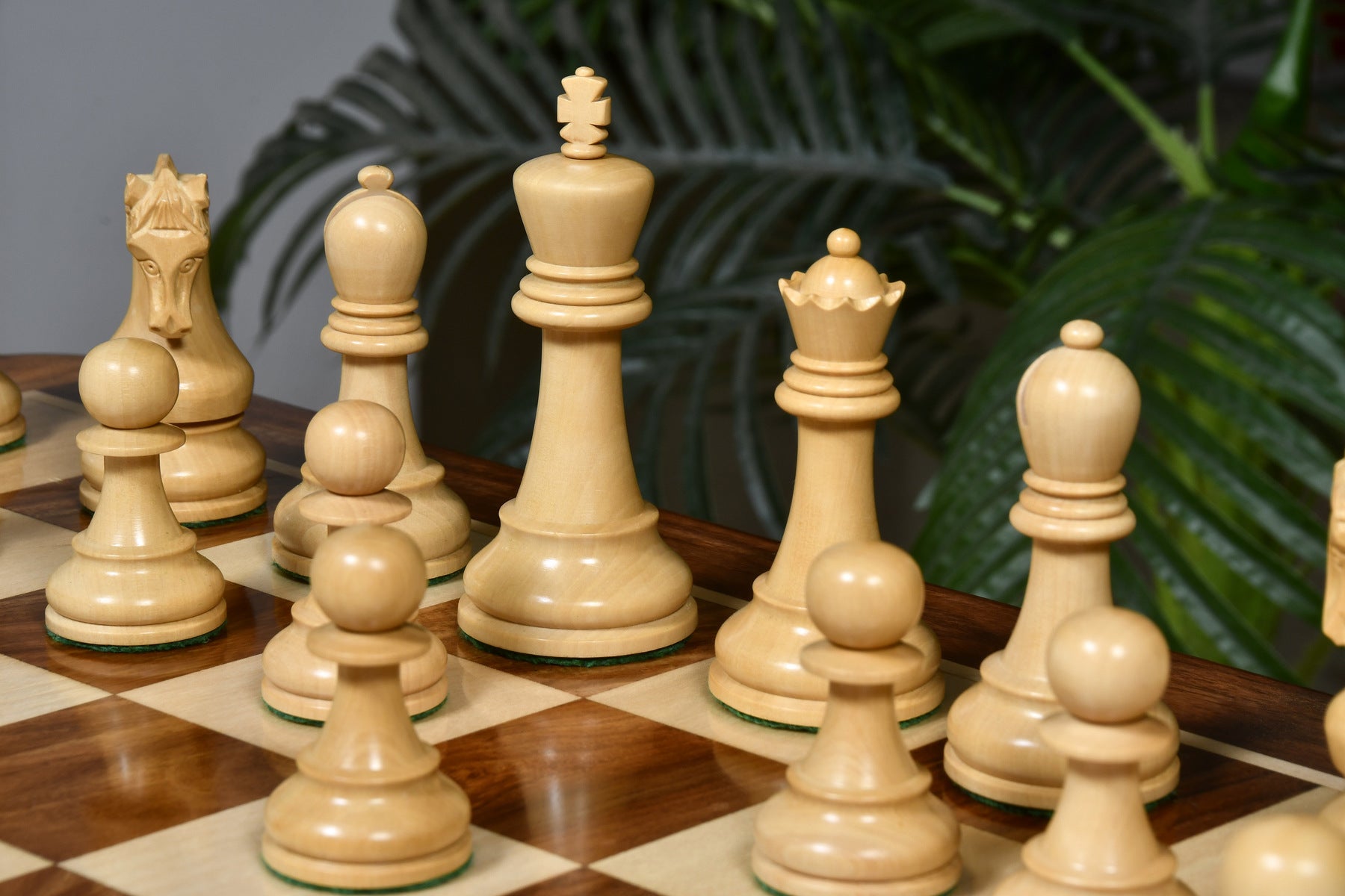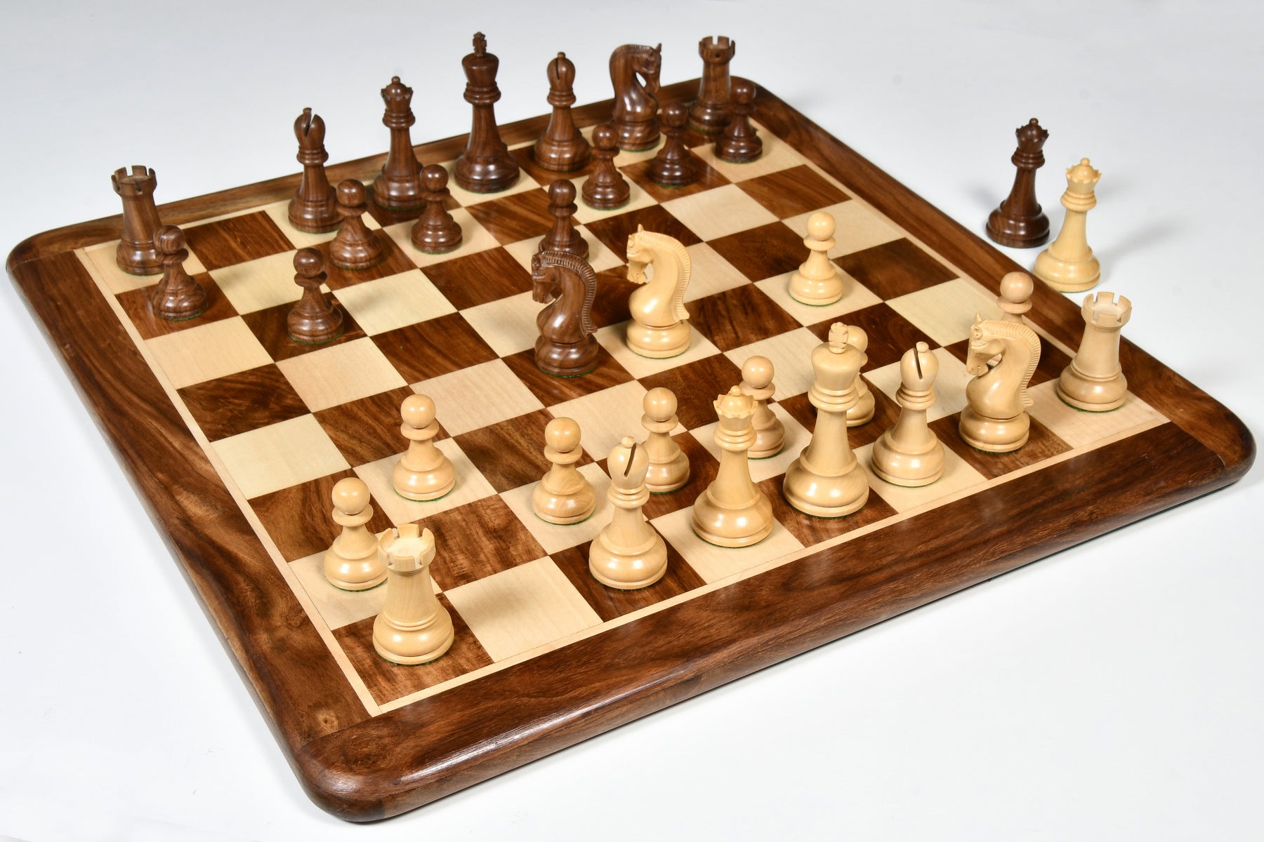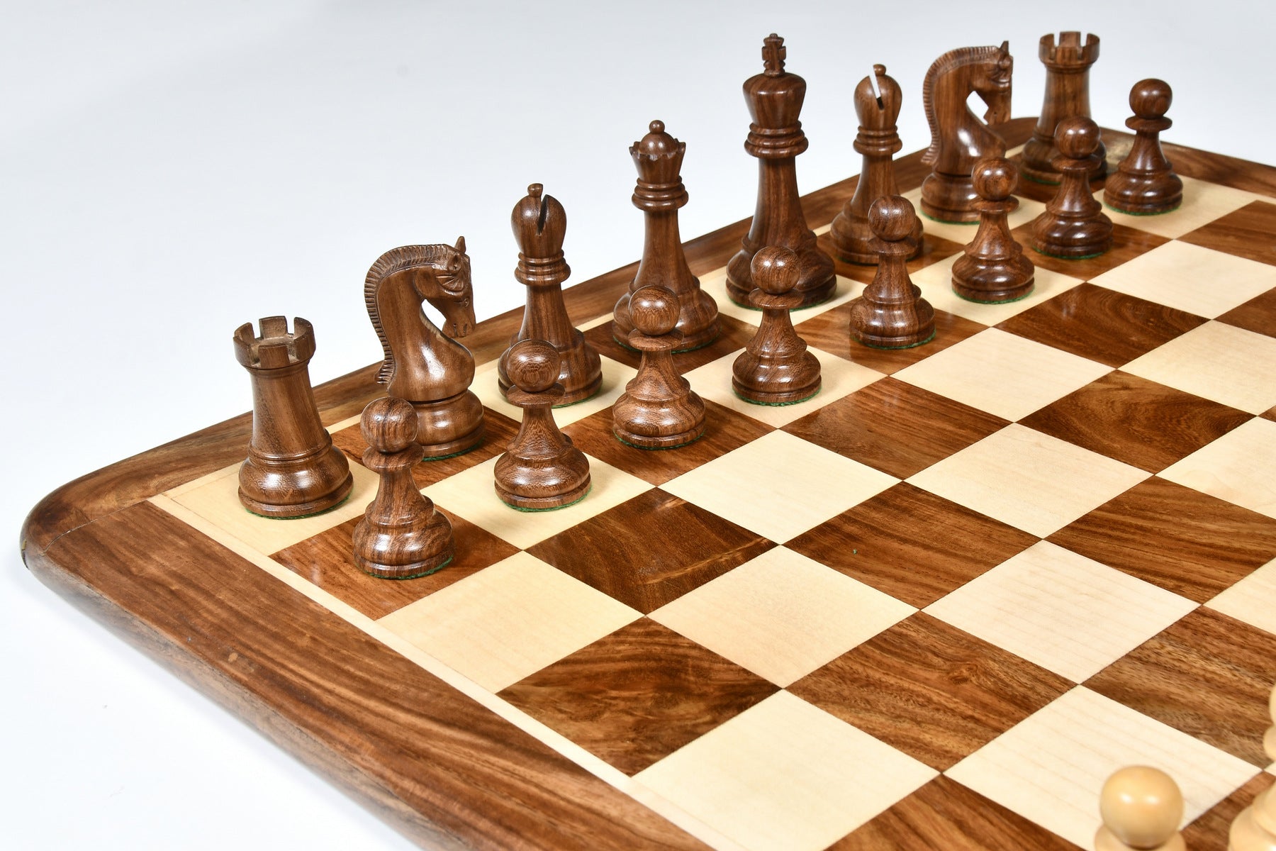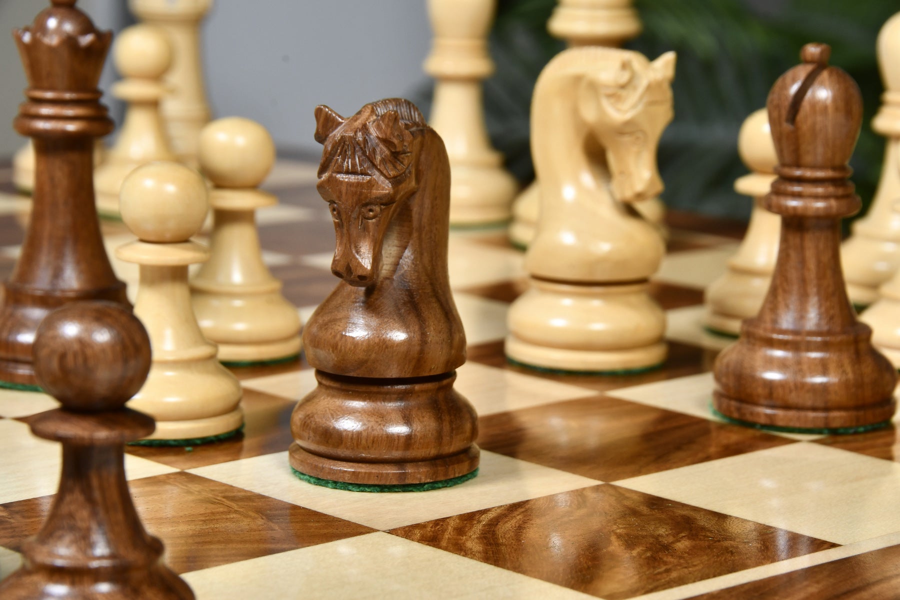 This premium chess set features Sheesham Wood for dark pieces and boxwood for the white. The King stands at 4.0 inches with a 1.6-inch base. Sheesham Wood offers a luxurious texture, and all pieces are expertly carved, triple-weighted, and fitted with thick green felt for smooth movement. Extra queens are included for easy pawn promotion, and the knights showcase masterful carving skills.