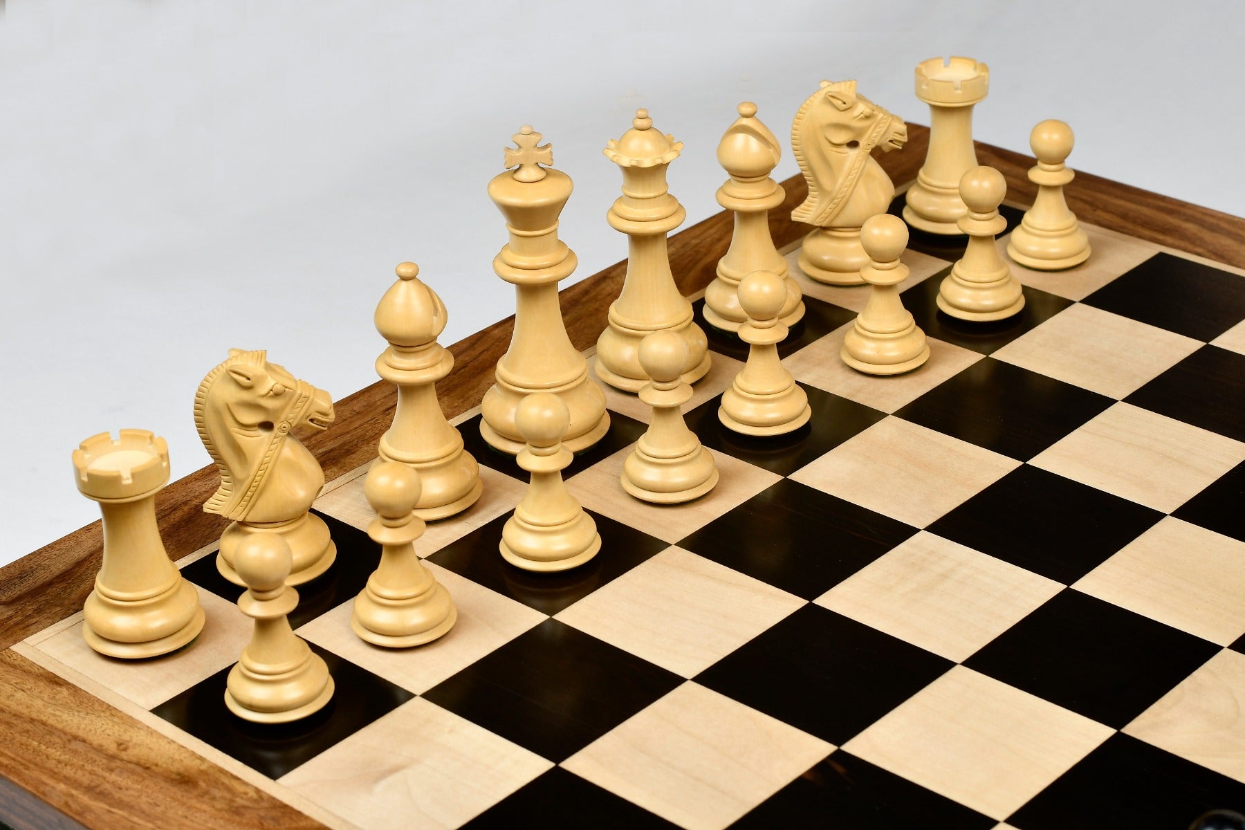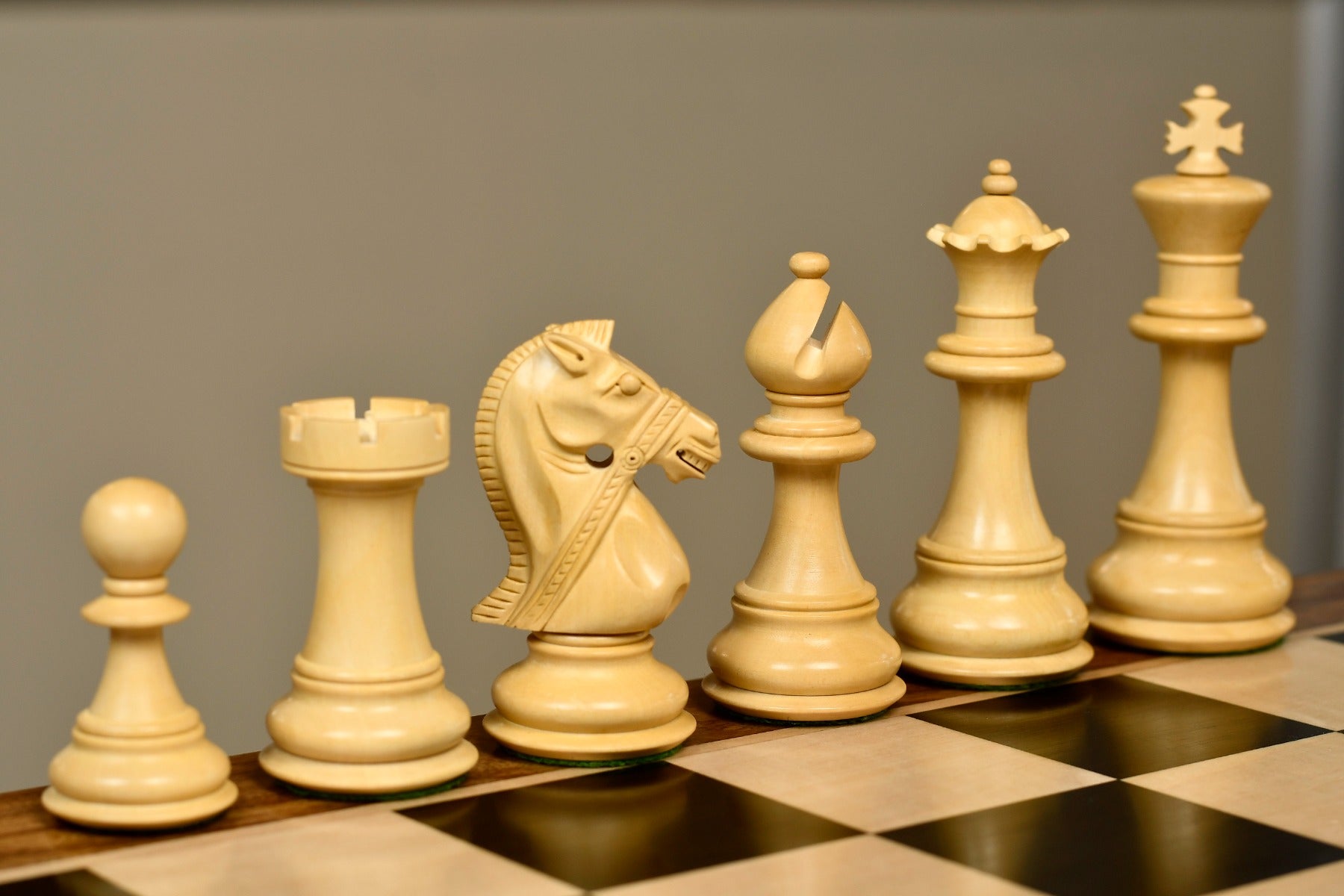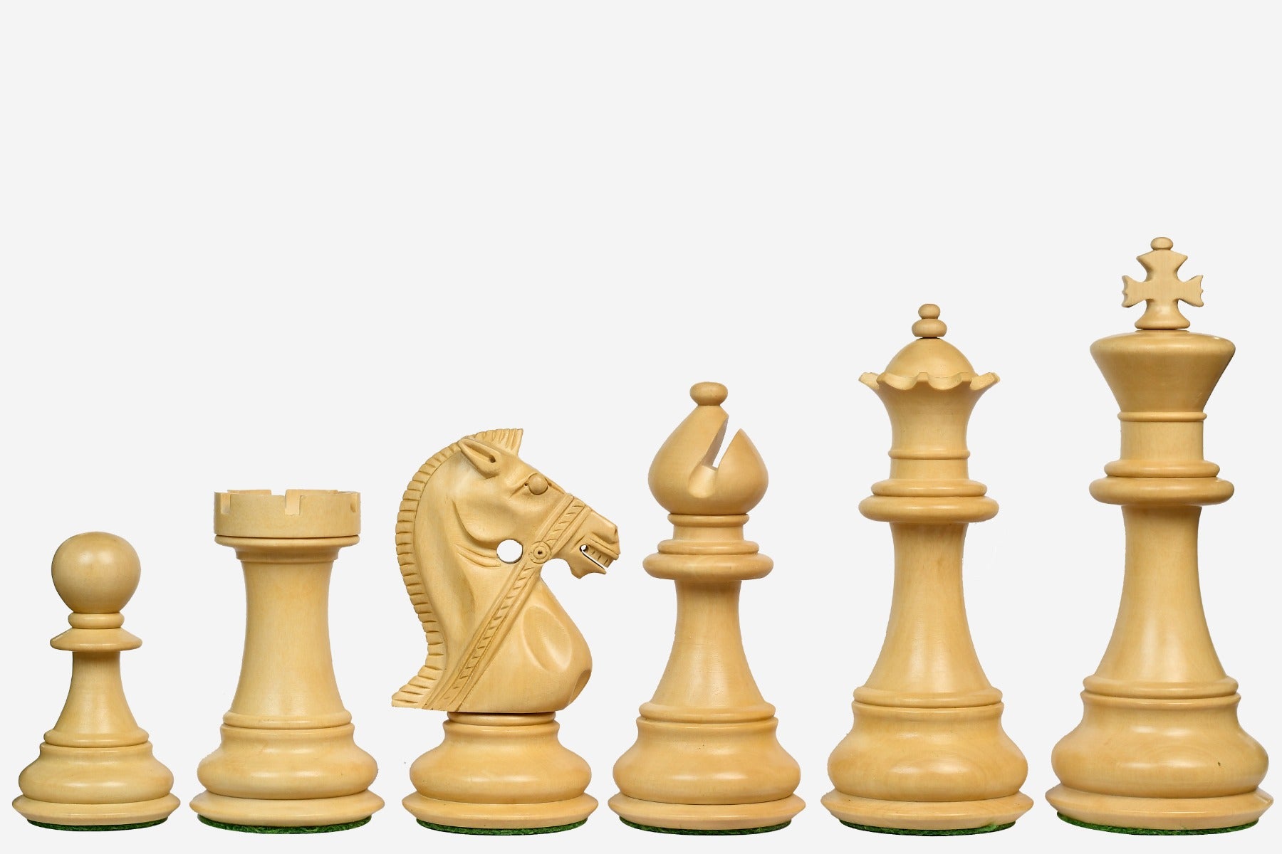 Features : The Bridle Series weighted chess pieces offers a 4.8" King with a diameter of 1.8" and all chess pieces are triple weighted by adding stud of iron in the base. The chess pieces are felted with thick green felt on the base of every chessmen. The dark side is made of Ebony Wood and the lighter side is made of Boxwood.