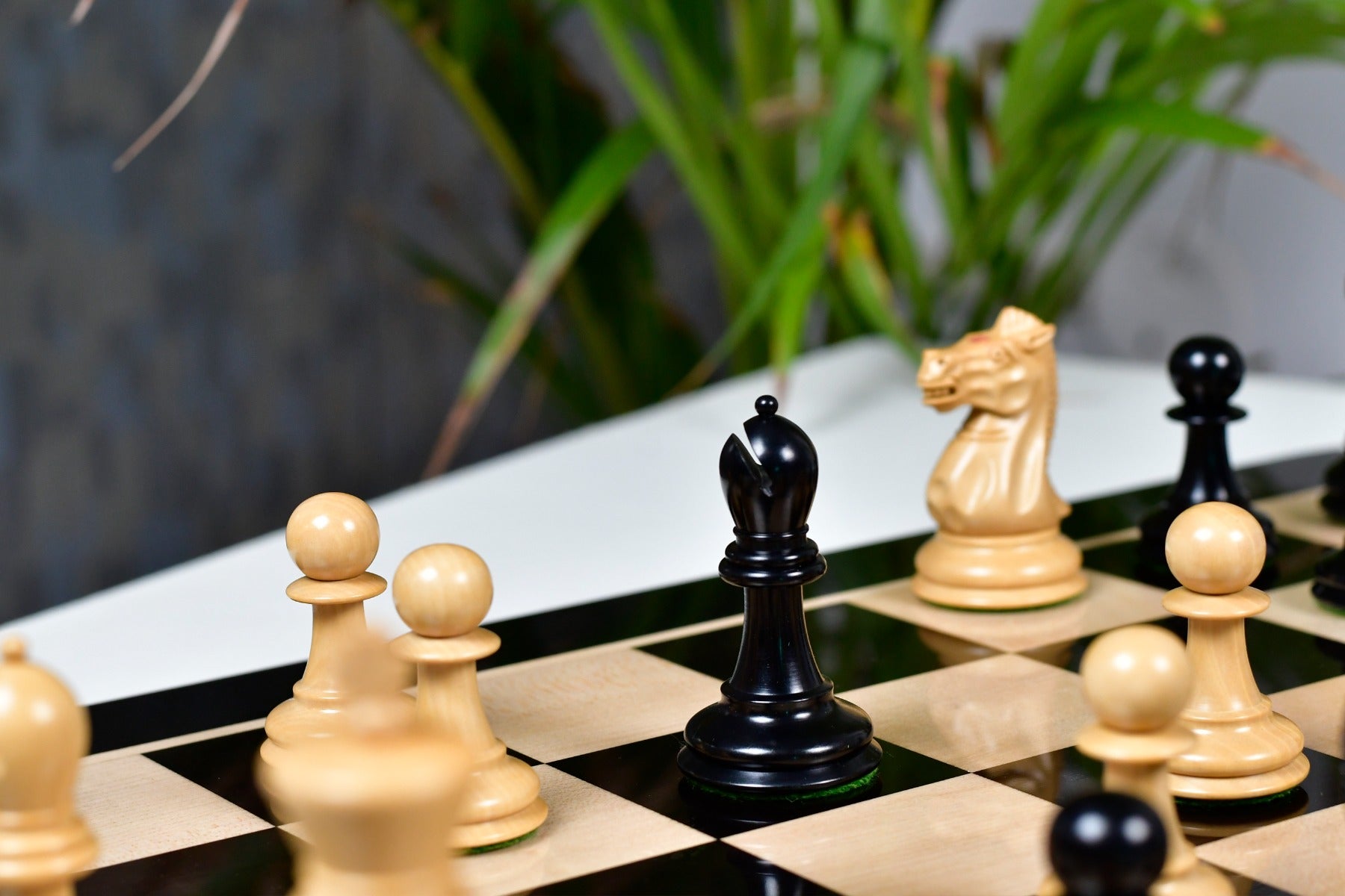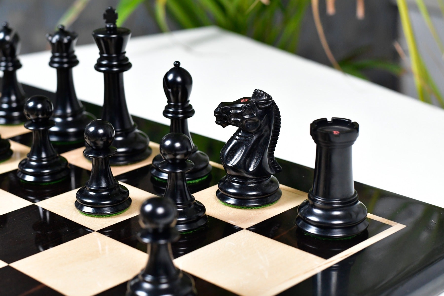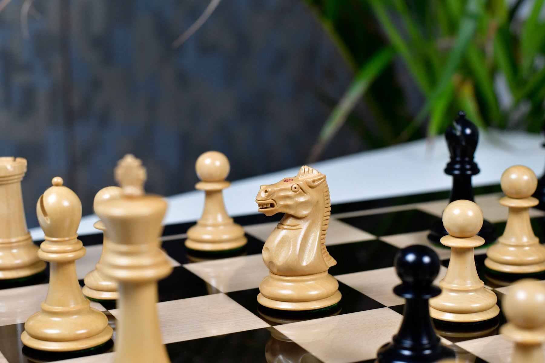 Introduction: After the overwhelming response to our Reproduced Jaques Vintage Collection, chessbazaar® proudly adds a remarkable new entry to its vintage chess family — the Reproduction of the 1915 1925 Nimzovich Staunton Pattern Chess Set. This exquisite design, nearly impossible to find today in playable condition, is a collector’s dream that originally cost thousands of dollars when available. Our reproduction is a respectful tribute, offering chess enthusiasts a rare opportunity to own and play with a historically significant and visually striking chess set that once defined an era. Handcrafted in high-quality Ebony Wood and Natural Boxwood, the set features a 3.75 inch Tournament Size King with a wide 1.73 inch base. Each piece is double weighted for optimal balance and fitted with thick green felt for smooth and stable board movement. The knight, the highlight of the set, is deeply carved with expressive detail, showcasing the elite craftsmanship of our Indian artisans. The design remains faithful to the original Nimzovich Staunton pattern, known for its minimalist elegance and professional functionality. What makes this set even more special is the King's Side stamping, a traditional crown emblem engraved on the foreheads of knights and rooks placed on the King's side, serving both aesthetic and functional value.