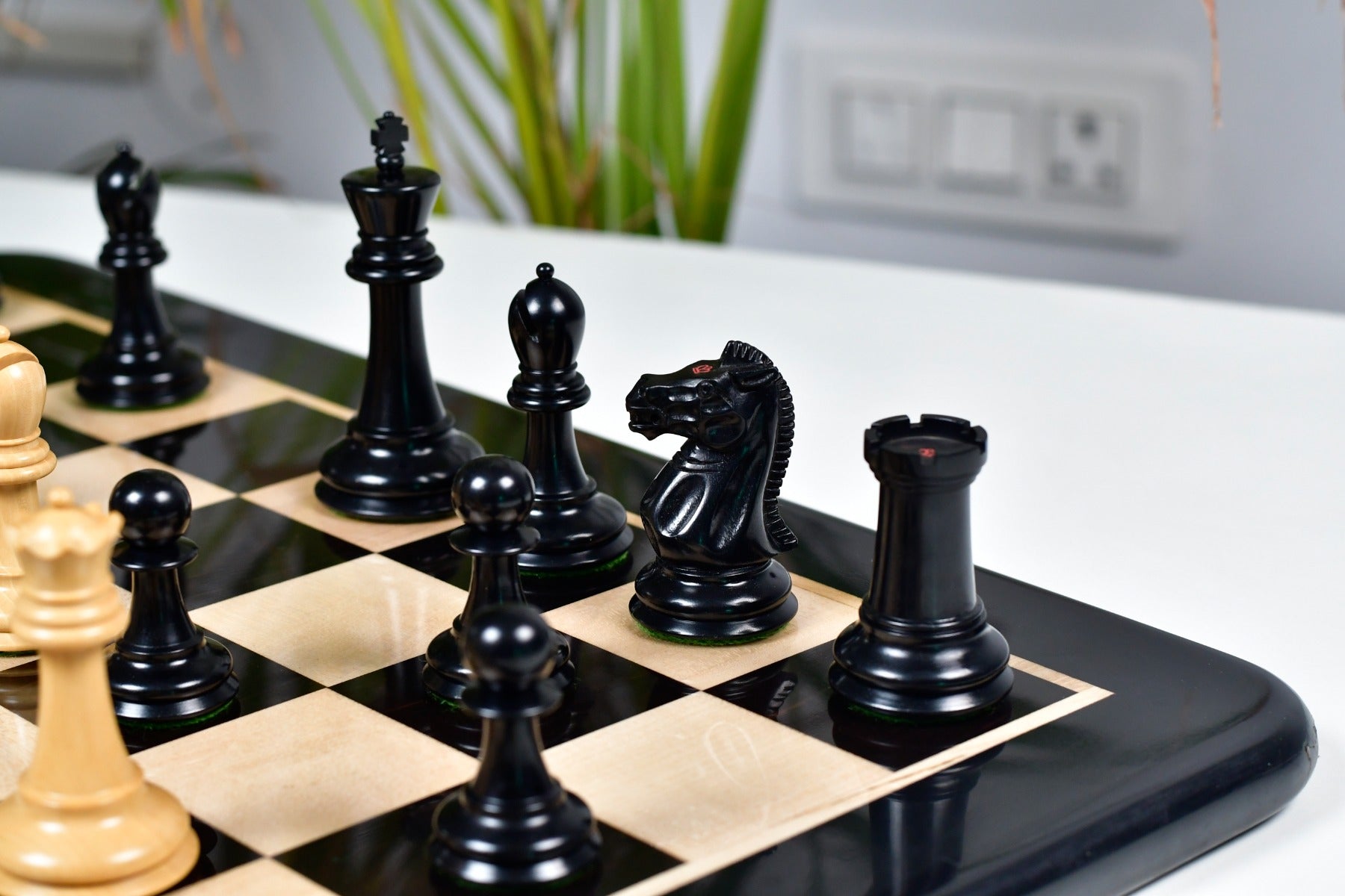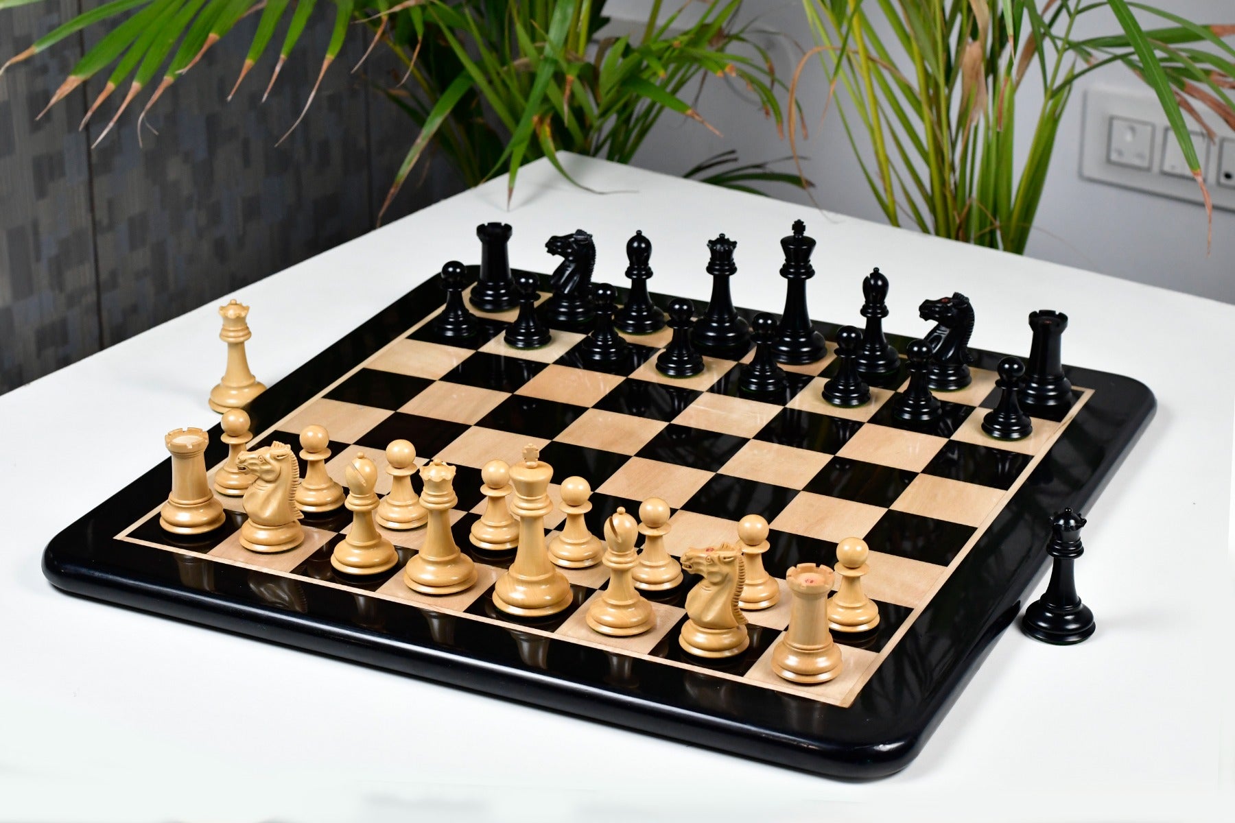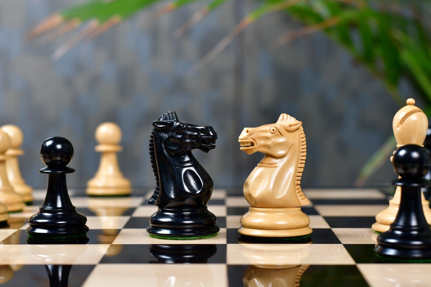 Introduction: After the overwhelming response to our Reproduced Jaques Vintage Collection, chessbazaar® proudly adds a remarkable new entry to its vintage chess family — the Reproduction of the 1915 1925 Nimzovich Staunton Pattern Chess Set. This exquisite design, nearly impossible to find today in playable condition, is a collector’s dream that originally cost thousands of dollars when available. Our reproduction is a respectful tribute, offering chess enthusiasts a rare opportunity to own and play with a historically significant and visually striking chess set that once defined an era. Handcrafted in high-quality Ebony Wood and Natural Boxwood, the set features a 3.75 inch Tournament Size King with a wide 1.73 inch base. Each piece is double weighted for optimal balance and fitted with thick green felt for smooth and stable board movement. The knight, the highlight of the set, is deeply carved with expressive detail, showcasing the elite craftsmanship of our Indian artisans. The design remains faithful to the original Nimzovich Staunton pattern, known for its minimalist elegance and professional functionality. What makes this set even more special is the King's Side stamping, a traditional crown emblem engraved on the foreheads of knights and rooks placed on the King's side, serving both aesthetic and functional value.