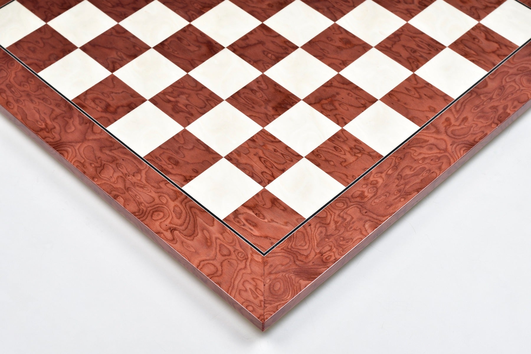 Made in Spain - This classic 21" wooden chess board is finest of the chess board a chess player or collector can have. Crafted from Red Ash Burl (dark) and Maple (light) veneer* this chess board features a Hi-Gloss finish.